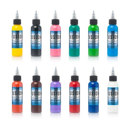 Primary Colours Set includes: White, Basic Black, Really Red, Orange, Atomic Yellow, Emerald Green, Gamma Green, Royal Blue, Light Blue, Bubblegum Pink, Pretty Purple, Power Brown 12 x 1oz bottles Fusion tattoo ink is organic, non-toxic and vegan safe.