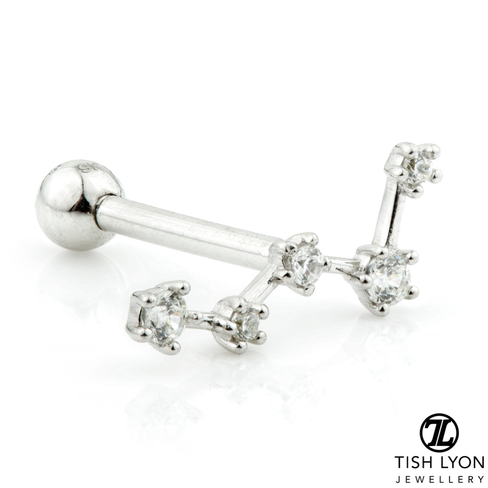 TISH LYON® Gold Gem Constellation Microbar Gem Sizes: 1.1mm(x2) / 1.3mm(x1) / 1.7mm(x2) Constellation Size: 15*4mm Bar Size: 1.0mm/1.2mm x 6mm or 8mm Ball: 3mm 14ct Gold Colour: Yellow or White Laser Mark on Ball (not on bar)