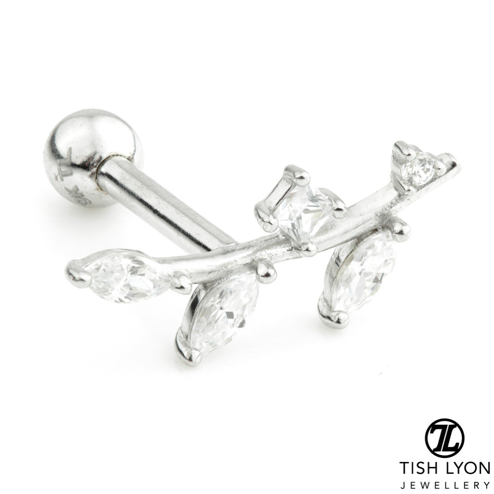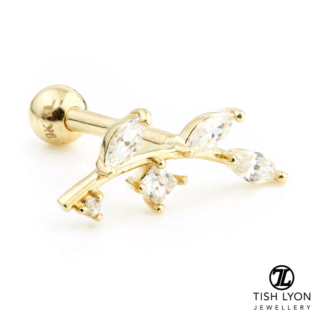 TISH LYON® 14ct Gold Gem Leaves Microbar Gem Sizes: 1mm(x1) / 1.5*1.5mm(x1) / 3*1.5mm(x3) Branch Size: 12*6mm Bar Size: 1.2mm x 6mm or 8mm Ball: 3mm Gold Colour: Yellow, White or Rose Left or Right Side 14ct Suitable for initial piercing Laser Mark on Ball (not on bar) TL