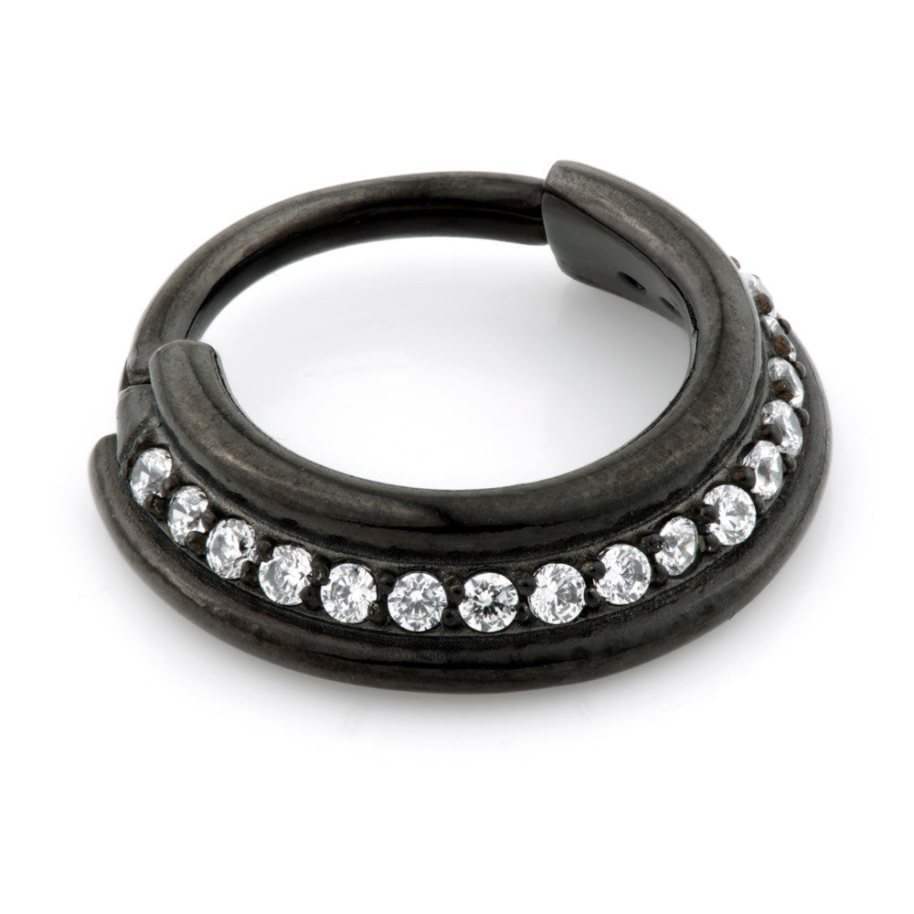 Gun Metal Black PVD Steel Hinge Flat Jewelled Pavé Conch Ring Gauge: 1.2mm Ring Diameter: 8mm or 10mm