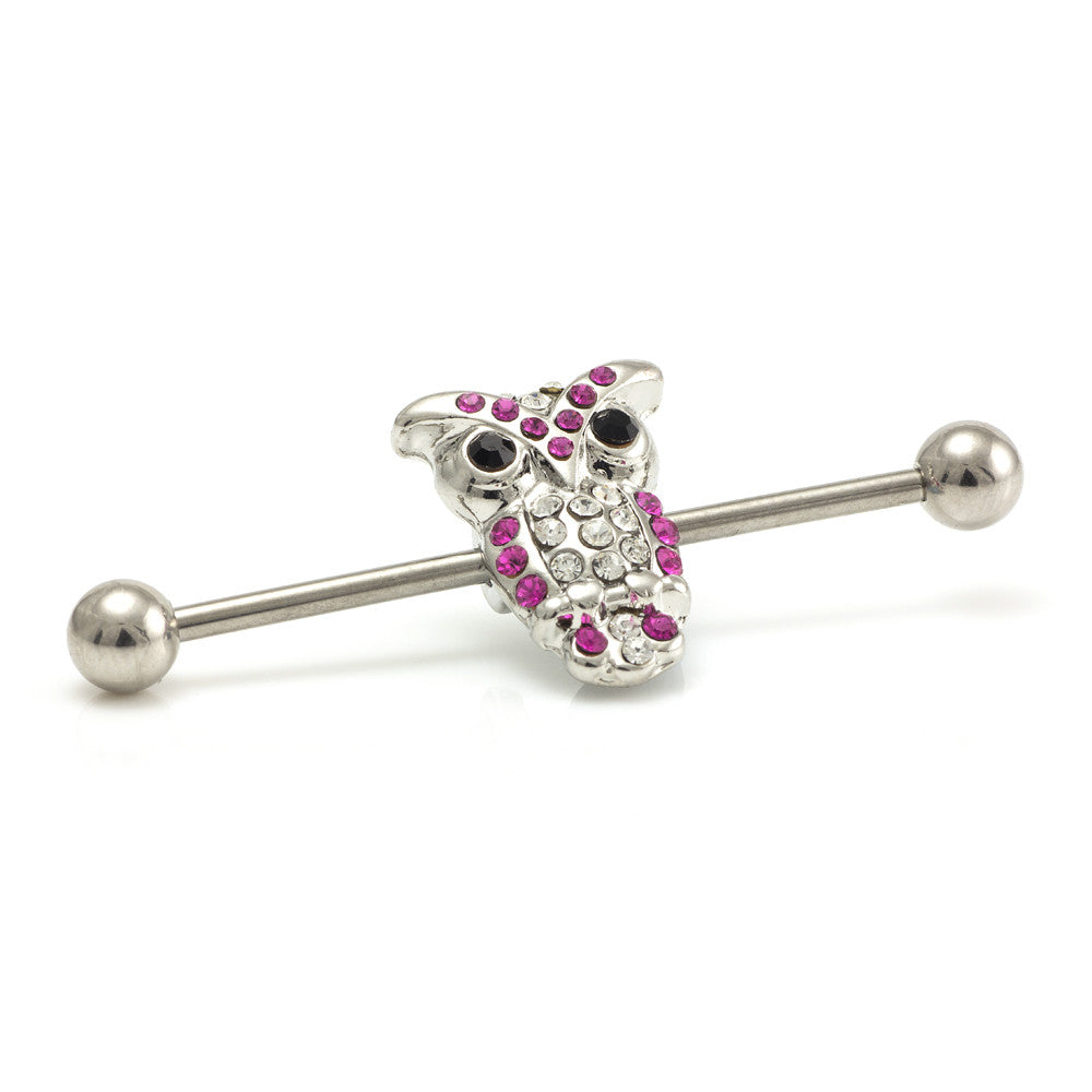 316L Steel Industrial Bar with Pink & Crystal Gem Owl Gauge: 1.6mm Sizes: 35mm / 38mm Ball Size: 5mm