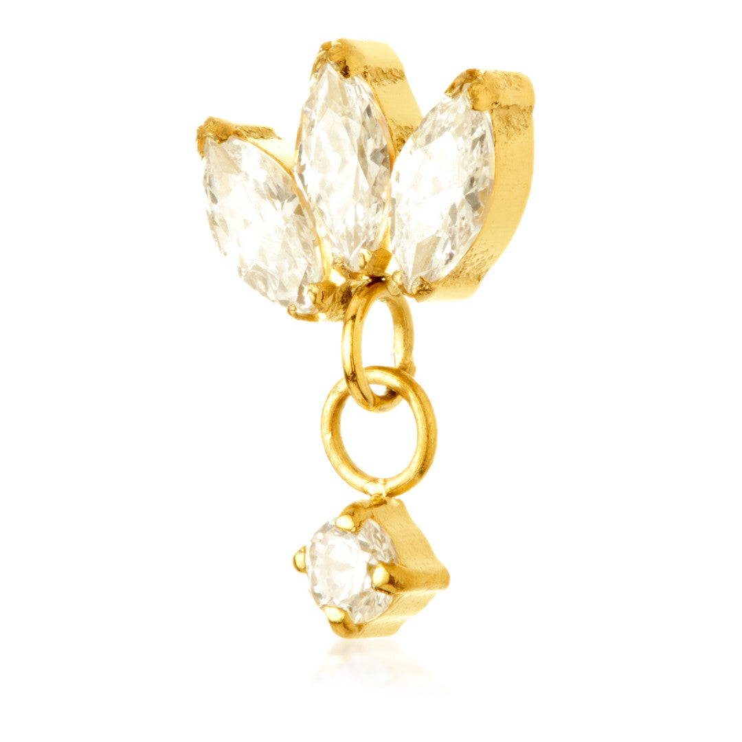 Internal Zircon Gold Ti Triple Jewelled Marquise with Hanging Prong Gem Attachment Gauge: 1.2mm (0.9mm thread) Attachment Size: 5mm x 6.5mm Gem Colour: CR CZ Gem Stones Medical Grade Titanium 6Al-4VEli ASTM:F-136