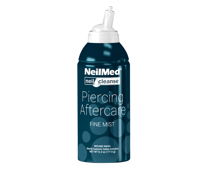 Neil Med Piercing Aftercare Fine Mist. Sterile Isotonic Saline Solution. To Cleanse Minor Wounds and Piercings. Directions for Use: Before use, spray a short stream of the aftercare spray in the air or on intact skin to test stream and to clear nozzle. To dispense, aim nozzle at the affected area or piercing and spray from a distance of 2 to 4 inches, or as is comfortable. Cover with clear cap after each use. Ingredients: USP Grade Water, USP Sodium Chloride (9 mg/mL) Preservative free. Warnings: Do not use if security sleeve is missing or tampered with. Do not use on burn injuries. Do not use in body orifices, ear canals or eyes. Not for injection. For individual use only. Apply as needed. Consult a healthcare professional for continued wound care management and for use on children younger than 2 years of age. Contents under pressure please do not puncture or incinerate. Keep out of reach of children. Do not use if package is damaged. If redness, swelling, or pain worsens, please seek the advice of your health care practitioner. Recommended storage conditions: Store between 59&degF and 86&degF (15&degC to 30&degC). Product can temporarily be exposed to temperatures ranging from 41&degF to 131&degF (5&degC to 55&degC) during transportation. Store out of direct sunlight, away from heat sources and avoid freezing.