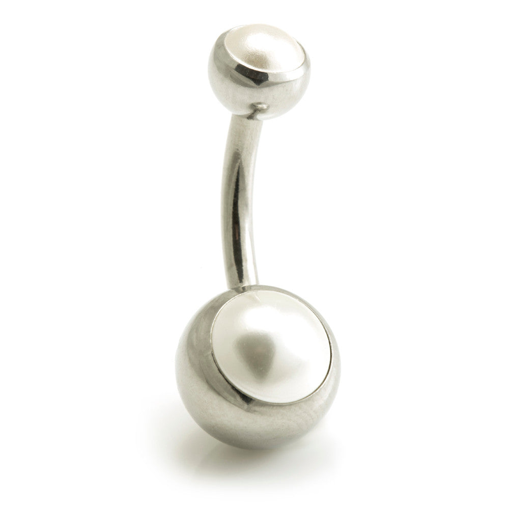Synthetic Pearl Steel Navel Ball Size: 8mm bottom ball, 5mm top ball Gauge: 1.6mm Length: 8mm or 10mm