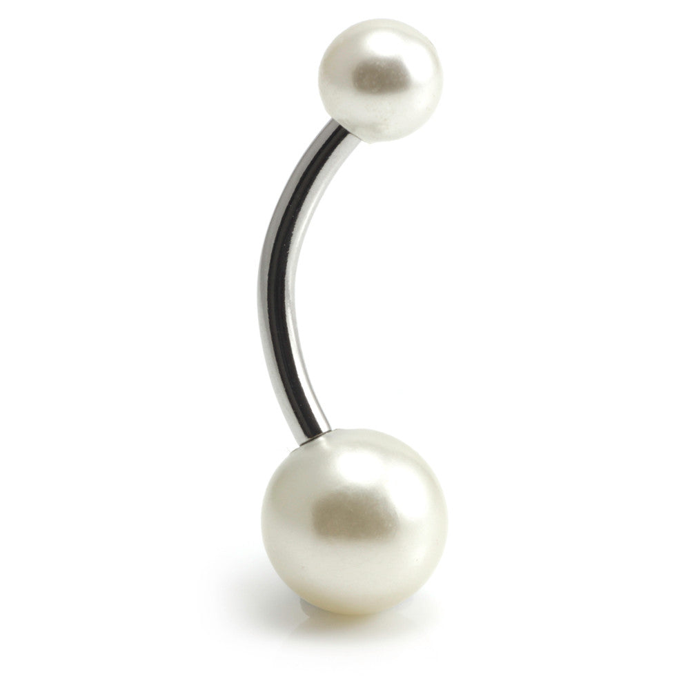 Synthetic Pearl Steel Navel Ball Size: 8mm bottom ball, 5mm top ball Gauge: 1.6mm Length: 6/8/10/12mm