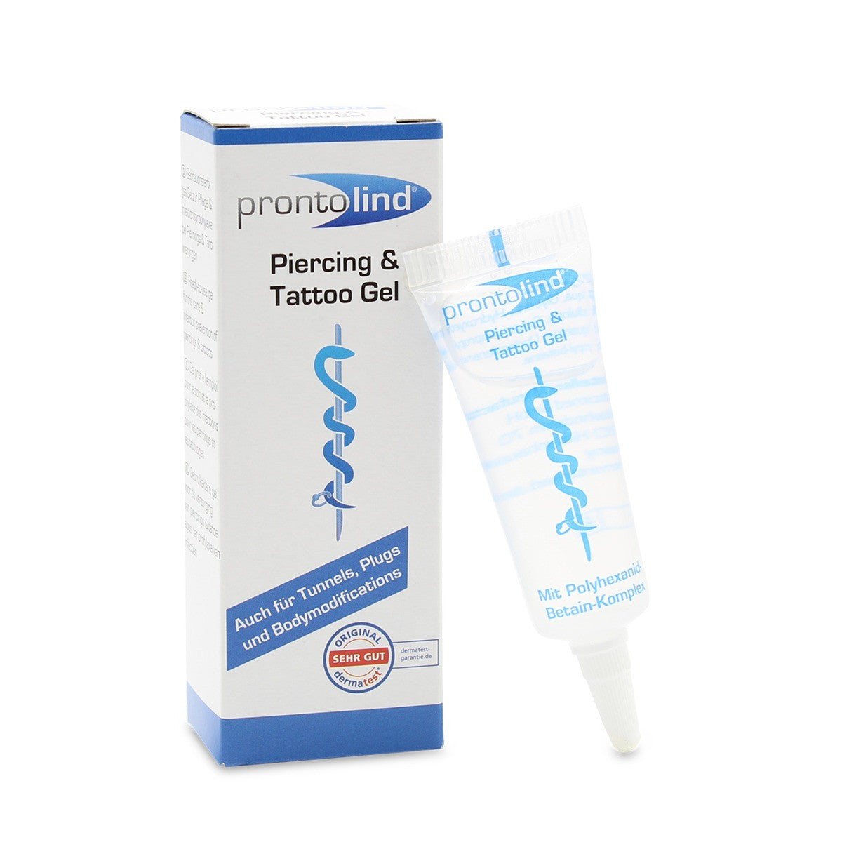 Prontolind Gel is suitable for all piercings which are covered with a bandage (e.g. Skindiver, Dermal Anchor, Microdermals), as well as for stretching and care for tunnels. By its good adhesion it can be used excellently in the area of nose and ear, disinfects and cares for irritated cutaneous Prontolind Gel is not only suitable for disinfecting new canals, but also as a lubricant when inserting tunnels and plugs. The gel is compatible with all modern jewellery and wound dressings and in combination with the Prontolind Tattoo Care Foam also ideal for use with tattoos. Made in Germany