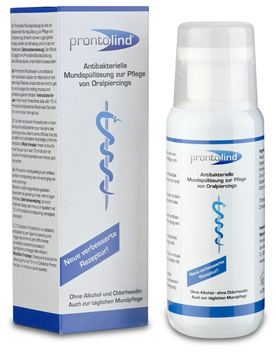 For all piercings in the oral area, e.g. lip and tongue piercings, Prontolind Mouth Rinsing Solution complements the Prontolind Mouth Spray for daily cleaning and disinfection. The solution does not contain sugar, alcohol or chlorhexidine and is ideally suitable for daily dental care. Biofilms form an ideal breeding ground for germs and bacteria. Prontolind mouth rinsing solution prevents the formation of this biofilm. Compared to many other mouthwashes, Prontolind Mouth Rinse does not cause yellowing of teeth or taste irritation and is also suitable for long-term use. Made in Germany
