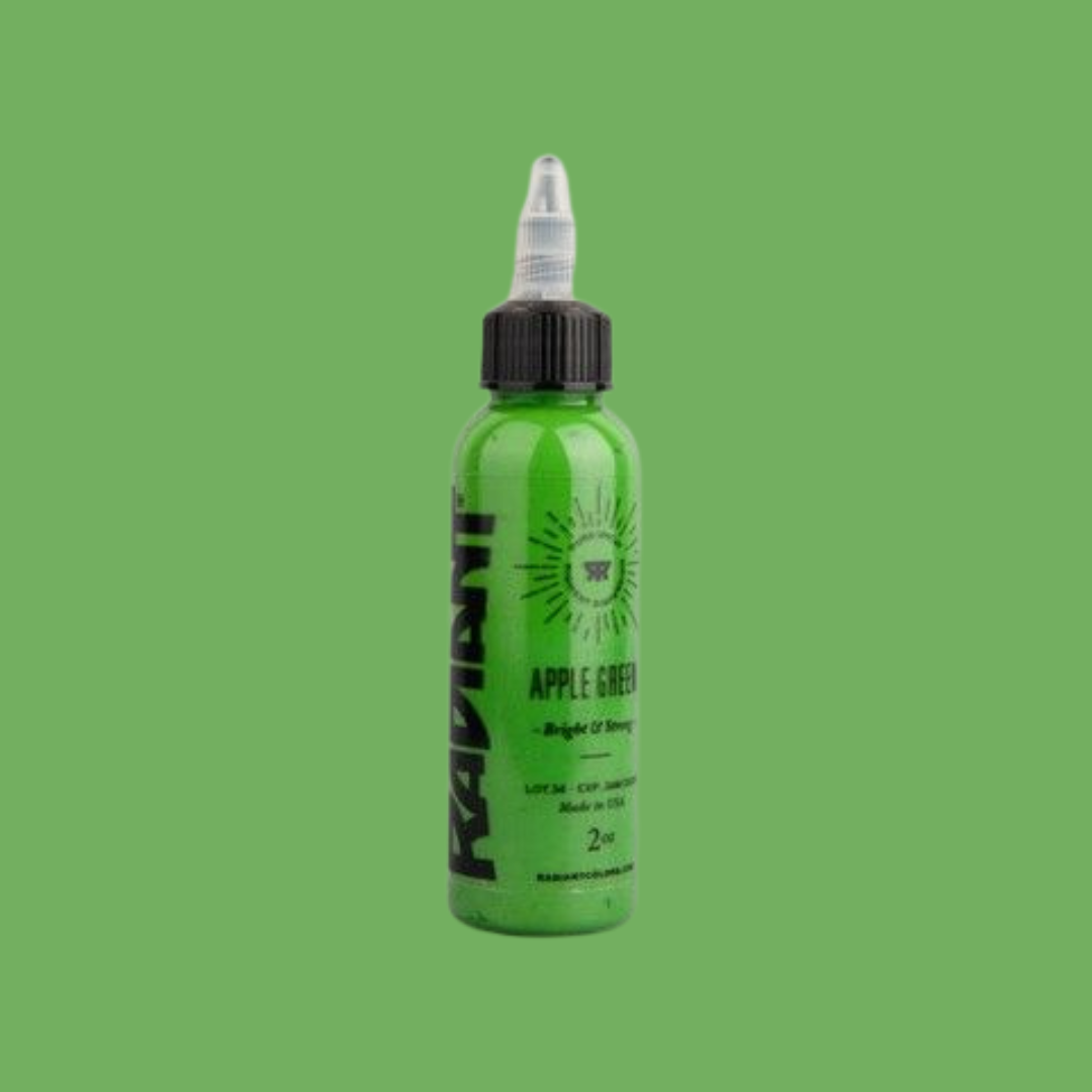 An apple green tasty enough to eat. Single bottle of https://www.wholesalebodyjewellery.com/tattoo-supplies/product/tattoo-inks/radiant.html Radiant Ink . Available in 1oz. Sterilised, easy to apply, pure, uncut homogenised pigment.