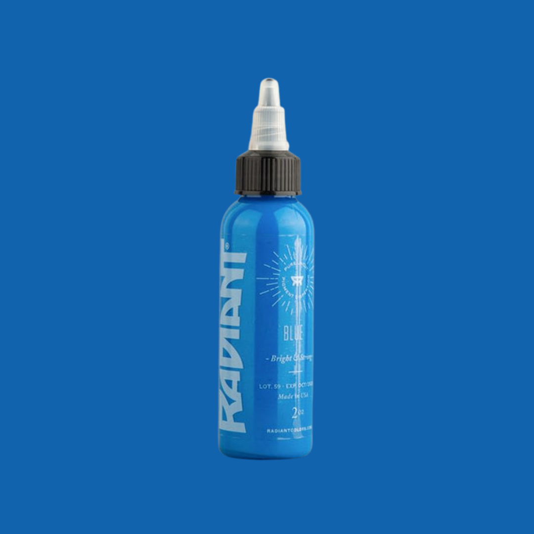 Simply blue, vibrantly done. Single bottle of https://www.wholesalebodyjewellery.com/tattoo-supplies/product/tattoo-inks/radiant.html Radiant Ink . Available in 1oz. Sterilised, easy to apply, pure, uncut homogenised pigment.