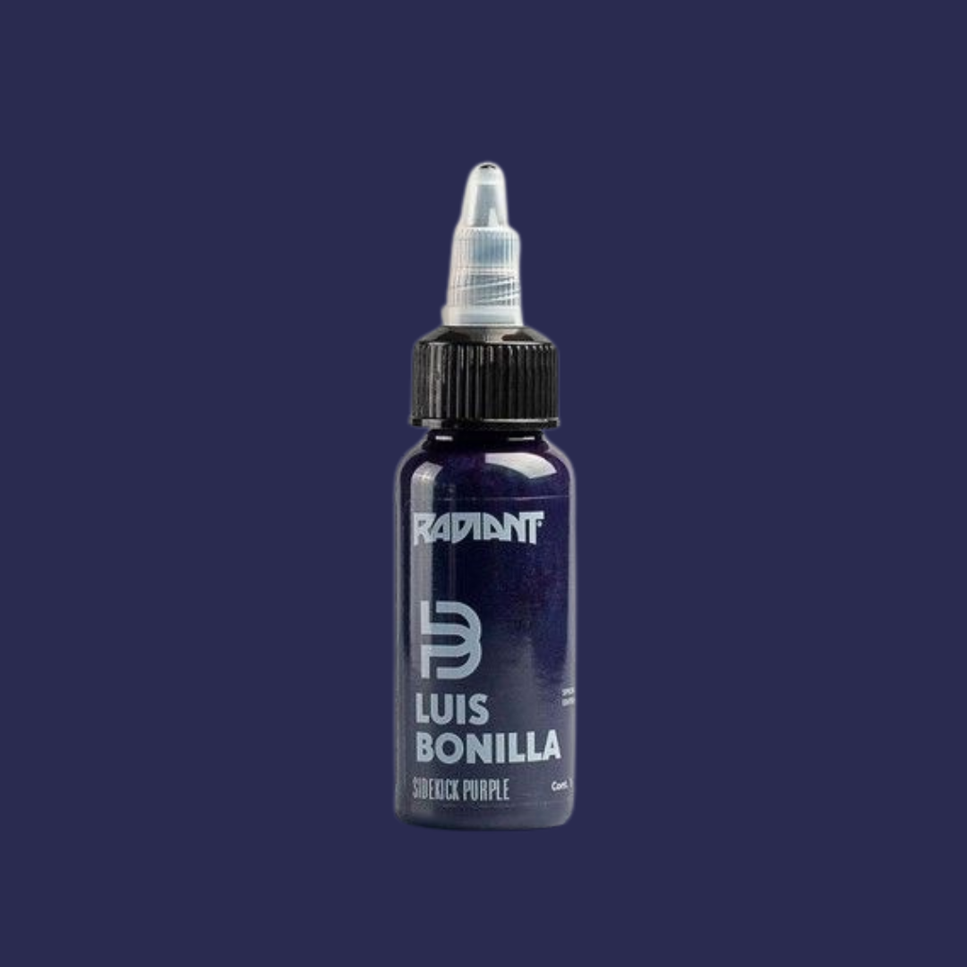 Sidekick Purple from the https://www.wholesalebodyjewellery.com/tattoo-supplies/product/tattoo-inks/radiant/bonilla.html Luis Bonilla Range . A solid and intense colour for all skin tones. Single bottle of https://www.wholesalebodyjewellery.com/tattoo-supplies/product/tattoo-inks/radiant.html Radiant Ink . Available in 1oz. Sterilised, easy to apply, pure, uncut homogenised pigment.