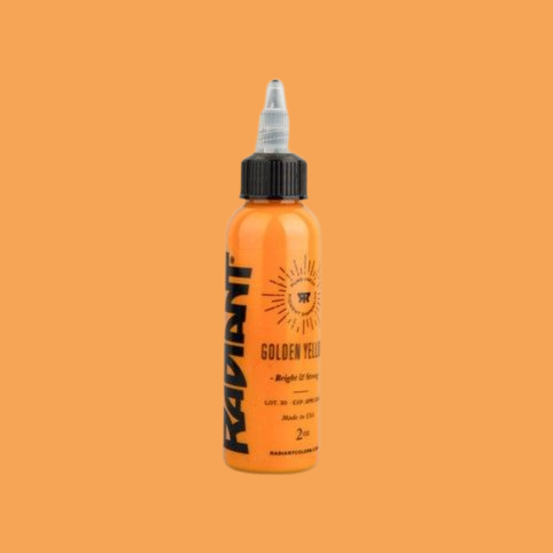 Bright and attractive like a gold bar. Single bottle of https://www.wholesalebodyjewellery.com/tattoo-supplies/product/tattoo-inks/radiant.html Radiant Ink . Available in 1oz. Sterilised, easy to apply, pure, uncut homogenised pigment.