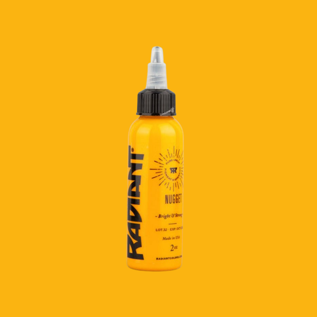 The closest colour to a nugget of pure gold. Single bottle of https://www.wholesalebodyjewellery.com/tattoo-supplies/product/tattoo-inks/radiant.html Radiant Ink . Available in 1oz. Sterilised, easy to apply, pure, uncut homogenised pigment.