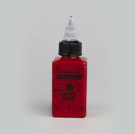 Peony Red from the https://www.wholesalebodyjewellery.com/tattoo-supplies/product/tattoo-inks/radiant/orient-ching.html Orient Ching Set . A brilliant red that can be used as a mid tone red. Single bottle of https://www.wholesalebodyjewellery.com/tattoo-supplies/product/tattoo-inks/radiant.html Radiant Ink . Available in 2oz. Sterilised, easy to apply, pure, uncut homogenised pigment.