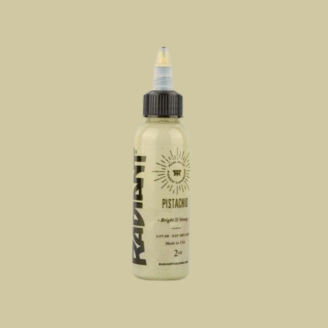 Choose Pistachio from https://www.wholesalebodyjewellery.com/tattoo-supplies/product/tattoo-inks/radiant/pastel.html Radiant's Pastel Range , because soft tones have never looked stronger. Single bottle of https://www.wholesalebodyjewellery.com/tattoo-supplies/product/tattoo-inks/radiant.html Radiant Ink . Available in 1oz. Sterilised, easy to apply, pure, uncut homogenised pigment.