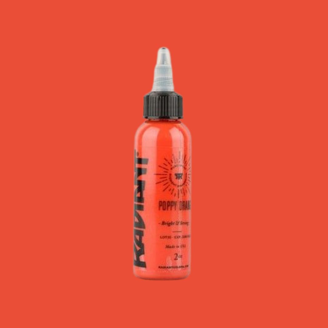 A stunning orange found in a Californian meadow. Single bottle of https://www.wholesalebodyjewellery.com/tattoo-supplies/product/tattoo-inks/radiant.html Radiant Ink . Available in 1oz. Sterilised, easy to apply, pure, uncut homogenised pigment.