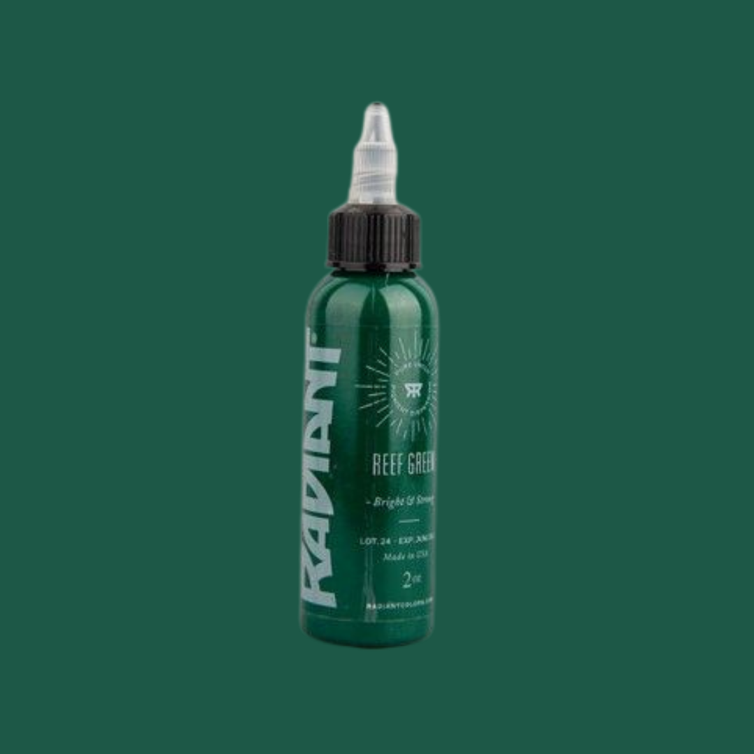 An elegant deep sea green. Single bottle of https://www.wholesalebodyjewellery.com/tattoo-supplies/product/tattoo-inks/radiant.html Radiant Ink . Available in 1oz. Sterilised, easy to apply, pure, uncut homogenised pigment.