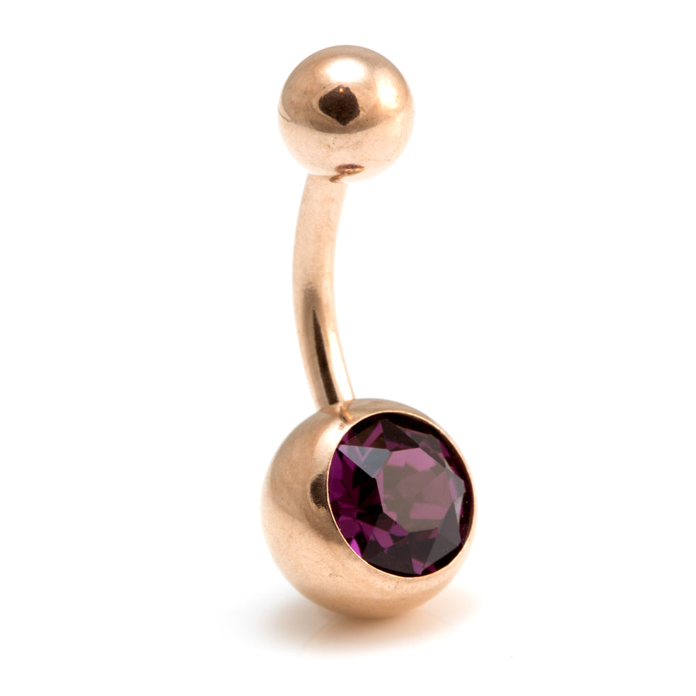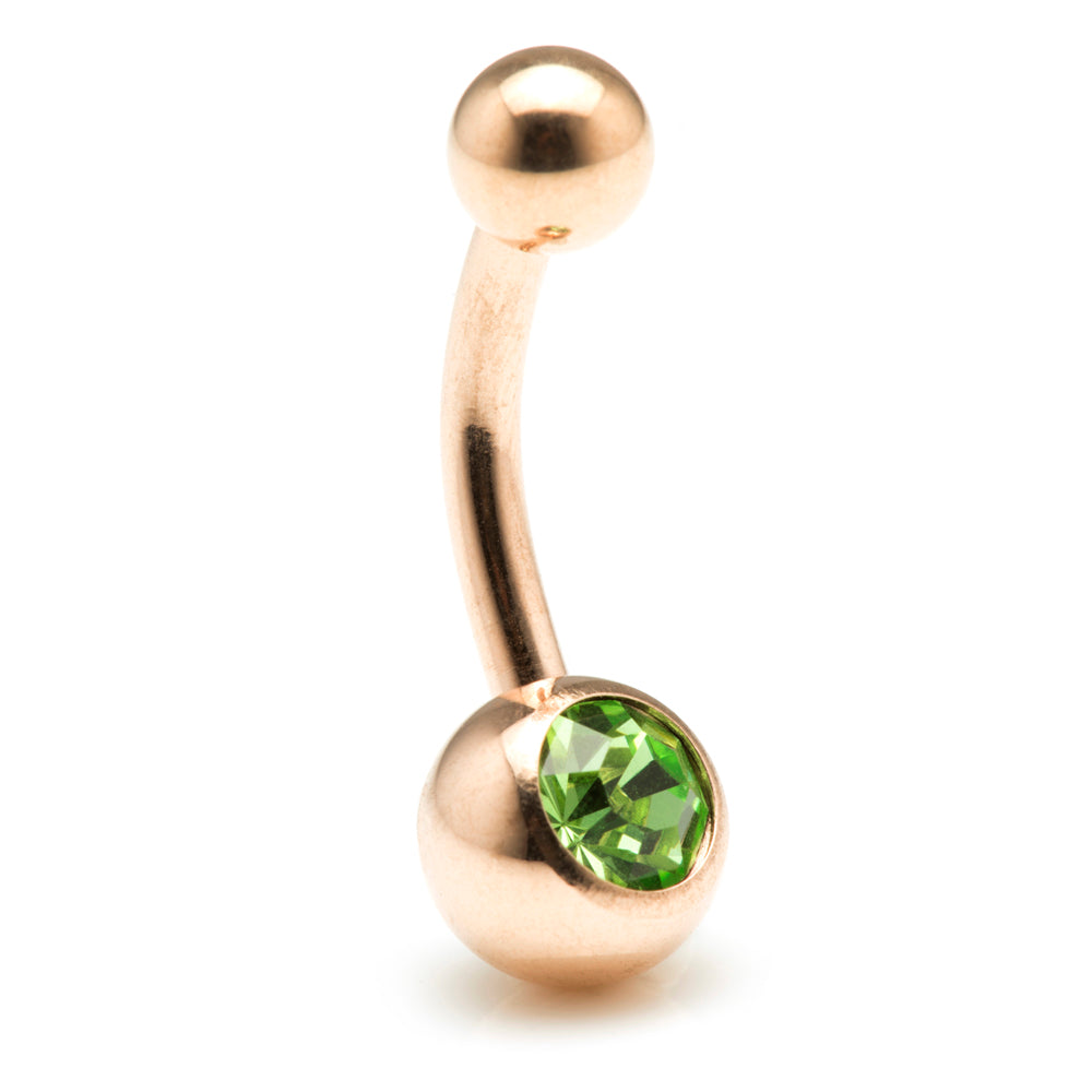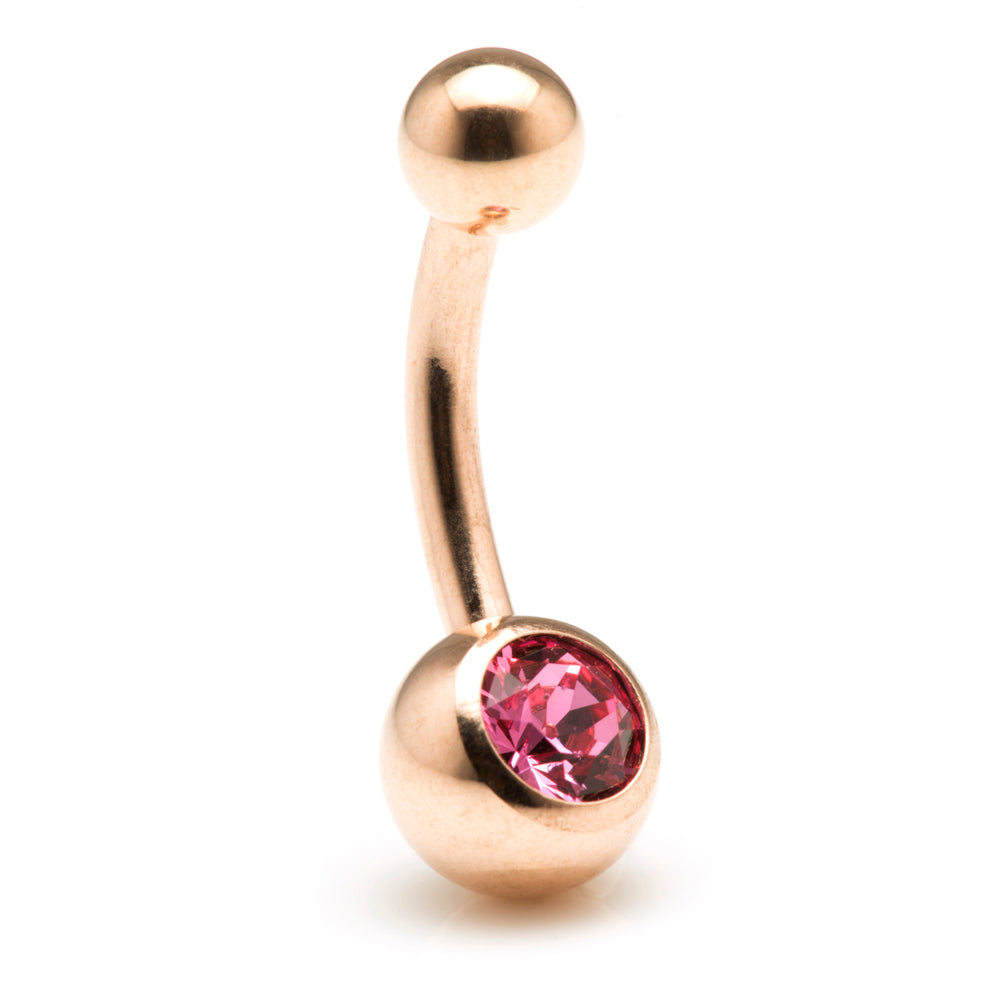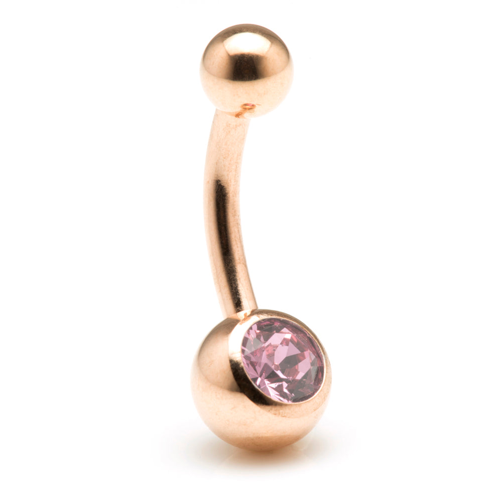 PVD Rose Gold on 316L Steel Gauge: 1.6mm Sizes: 8/10/12/14mm Ball Sizes: 5mm & 8mm Gem Colours: Crystal, AB Crystal, Amethyst, Aqua, Lt Rose, Lt Siam, Peridot, Sapphire, Rose