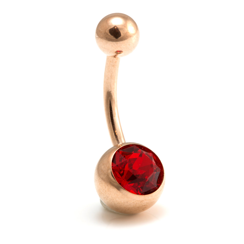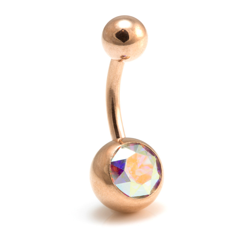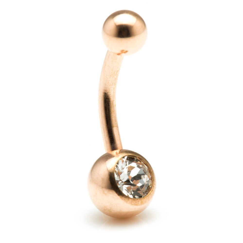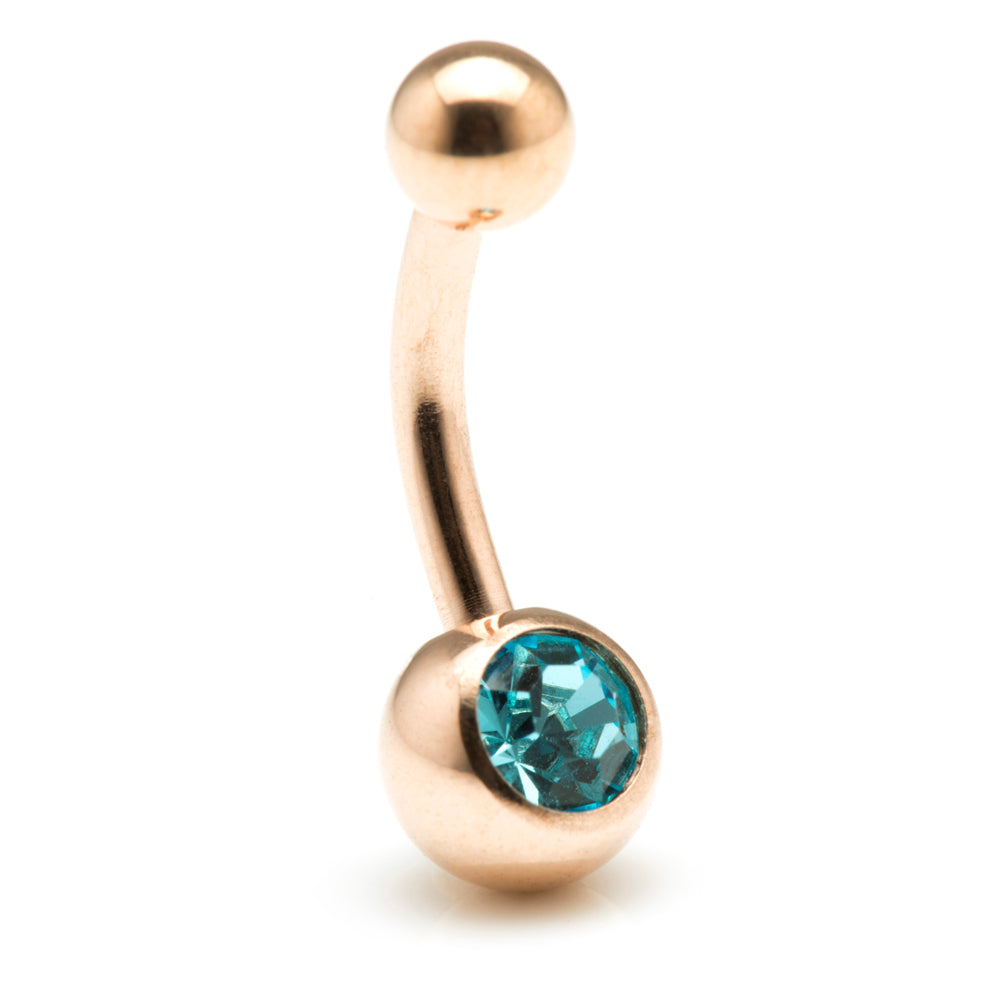 PVD Rose Gold on 316L Steel Gauge: 1.6mm Sizes: 8/10/12/14mm Ball Sizes: 5mm & 8mm Gem Colours: Crystal, AB Crystal, Amethyst, Aqua, Lt Rose, Lt Siam, Peridot, Sapphire, Rose