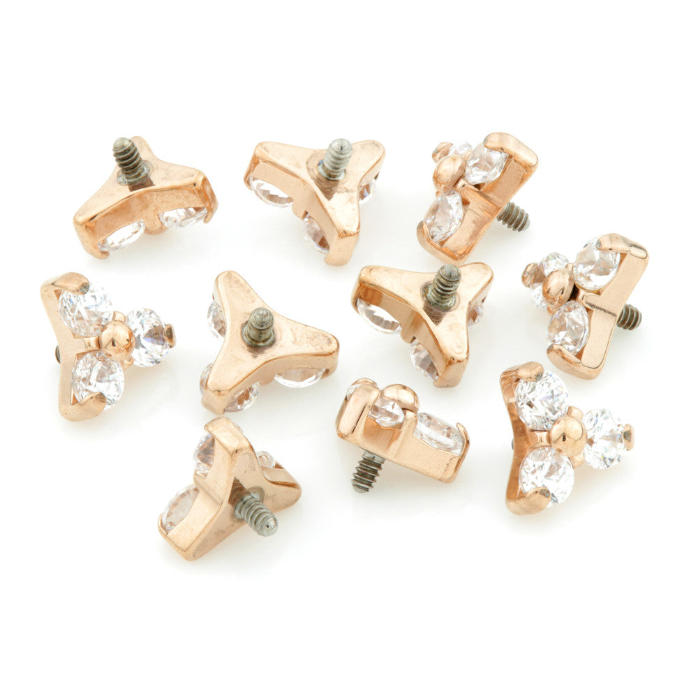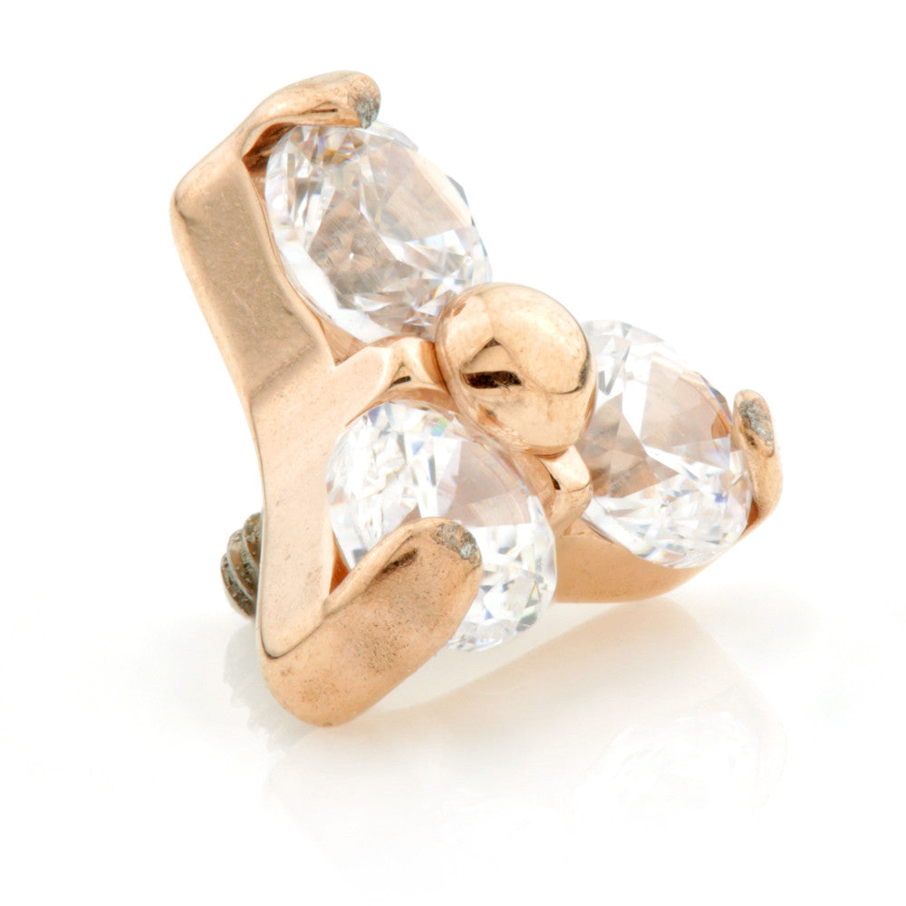 Rose Gold PVD Titanium Trinity with 3 Gems Gauge: 1.2mm with 0.9mm thread Gem Colour: Crystal Titanium Colours Available Approx Size: Small = 4mm (1.5mm gems) Medical Grade Titanium 6Al-4VEli ASTM:F-136