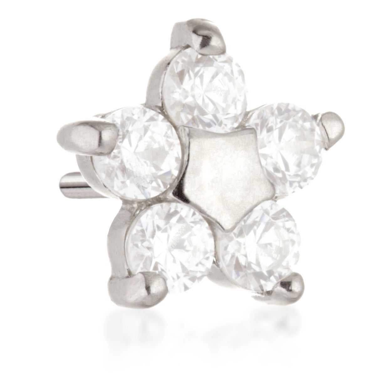 TISH LYON® 14ct Gold Flower Gem Pin Attachment Attachment Size: 5mm Gold Colour: Yellow or White Gem Colour: Crystal 316L Surgical Steel Pin Packaged in small grey presentation box Suitable for initial piercing