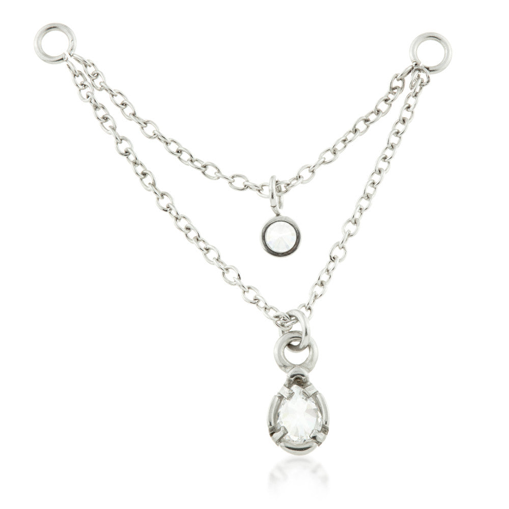 Steel Double Hanging Gem Chain Charm Chain Length: 3cm Gem Sizes: Circle Gem (2mm), Tear Drop Gem (4x2mm) O-ring Inner Diameter: 2mm