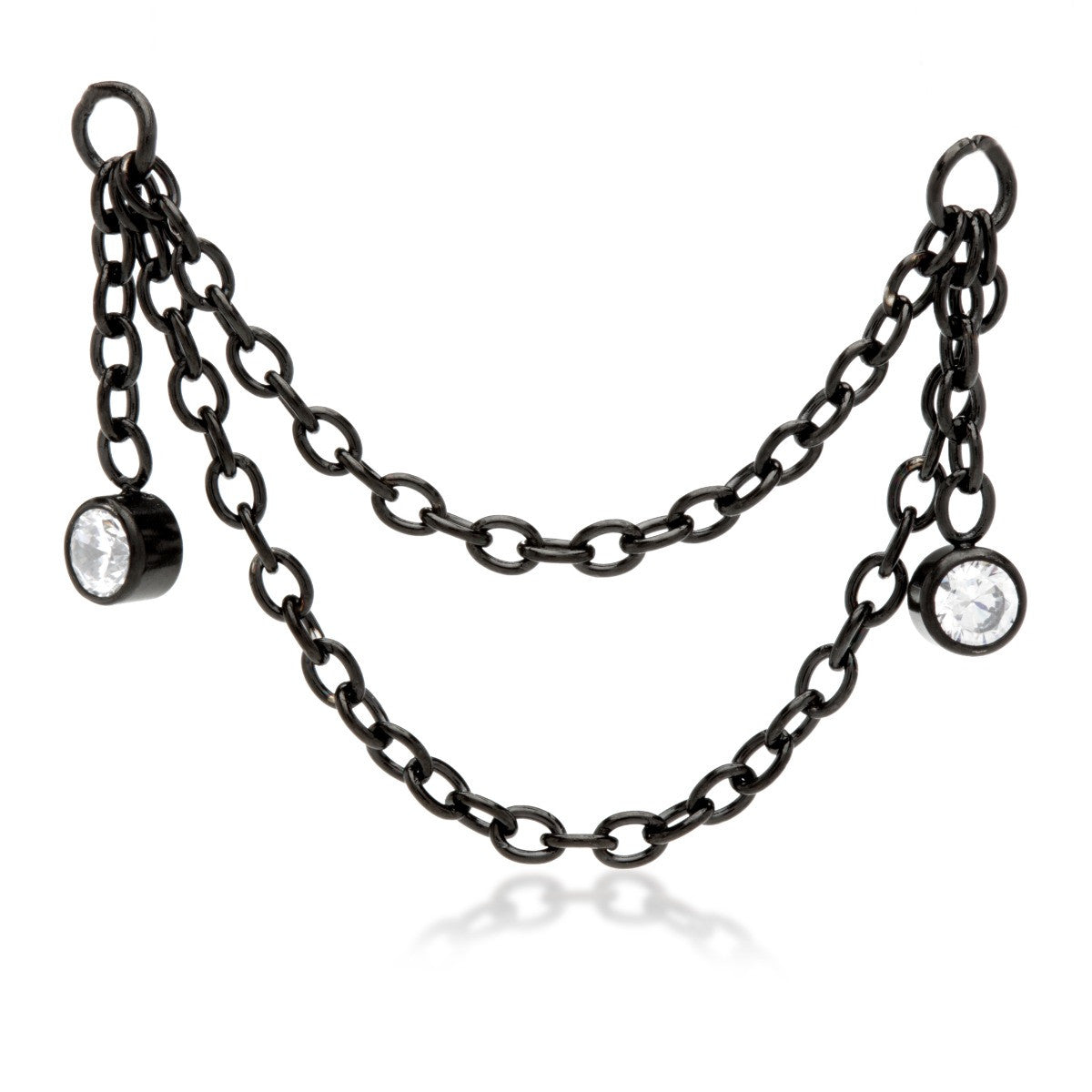 Black Steel Hanging Double Chain with Hanging Gems Chain Length: 16+24/20+28/25+34/32+48/38+52 Side Chain Length: 10mm Oring Inner Diameter: mm Gem Size: 3mm Gem Colour: CR CZ Gem Stones 316L Surgical Steel