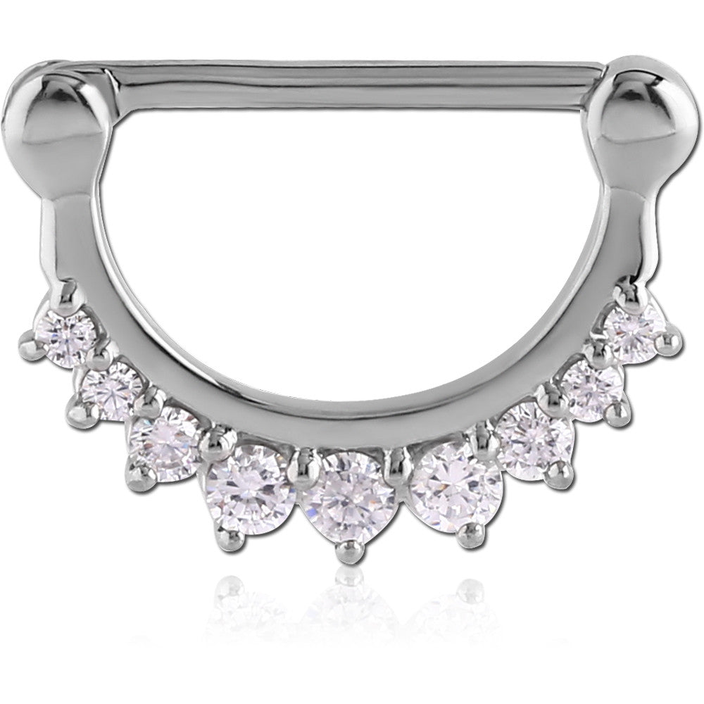 Cast Steel Nipple Clicker with Swarovski Crystal Gems Similar fastening to septum rings Size: 14mmGem Colours: Crystal, Aurora Borealis