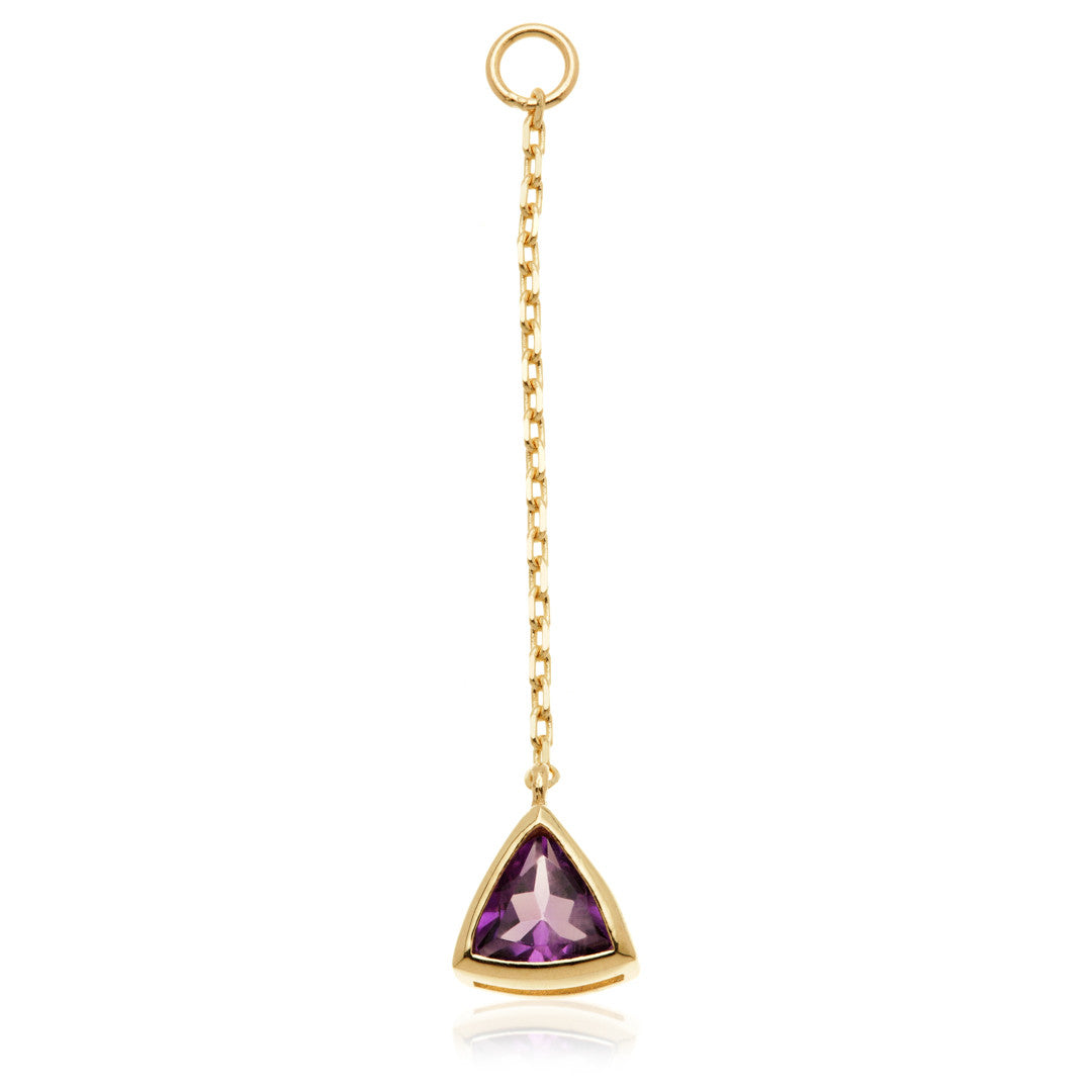 Pheobe Natural Amethyst Trillion Gem Earring Charm Part of the stunning Tish Lyon Natural Amethyst Collection, this fun charm offers a playful element of movement, to take your piercings to the next level. Pair with a flatback stud or hoop. Crafted from 14ct solid gold, natural amethyst gemstone. Perfect for: lobe, helix. Sold individually (select 2 for a pair). Chain length: 20mm Gem size: 5mm