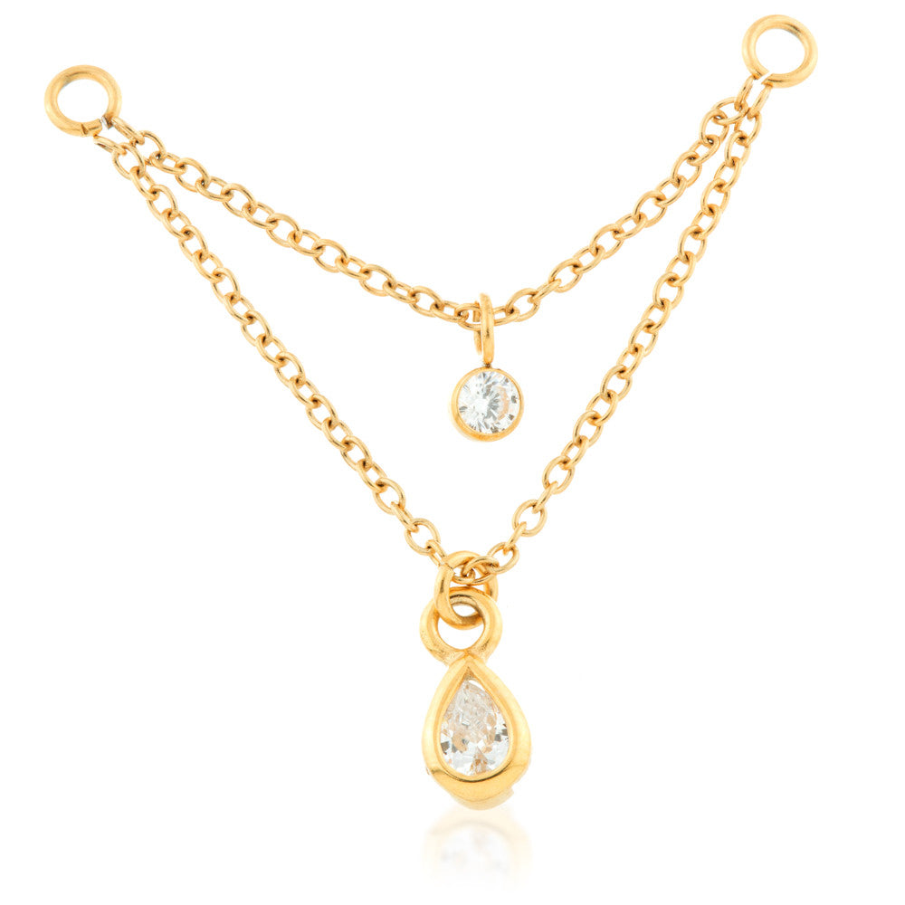 Zircon Gold Steel Double Hanging Gem Chain Charm Chain Length: 3cm Gem Sizes: Circle Gem (2mm), Tear Drop Gem (4x2mm) O-ring Inner Diameter: 2mm