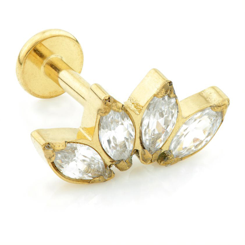 Zircon Gold Ti Threadless Labret with Marquise Gem Crescent Top Gauge: 1.2mm (threadless) Labret Sizes: 8mm Gem Colour: Crystal Fits all Pop's Medical Grade Titanium 6Al-4VEli ASTM:F-136