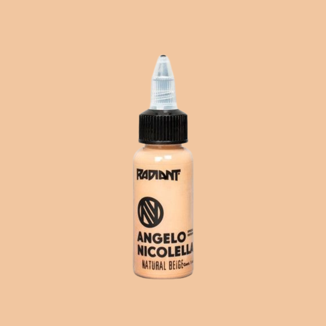 Natural Beige from the https://www.wholesalebodyjewellery.com/tattoo-supplies/product/tattoo-inks/radiant/angelo-nicolella.html Angelo Nicolella Set . Single bottle of https://www.wholesalebodyjewellery.com/tattoo-supplies/product/tattoo-inks/radiant.html Radiant Ink . Available in 1oz. Sterilised, easy to apply, pure, uncut homogenised pigment.