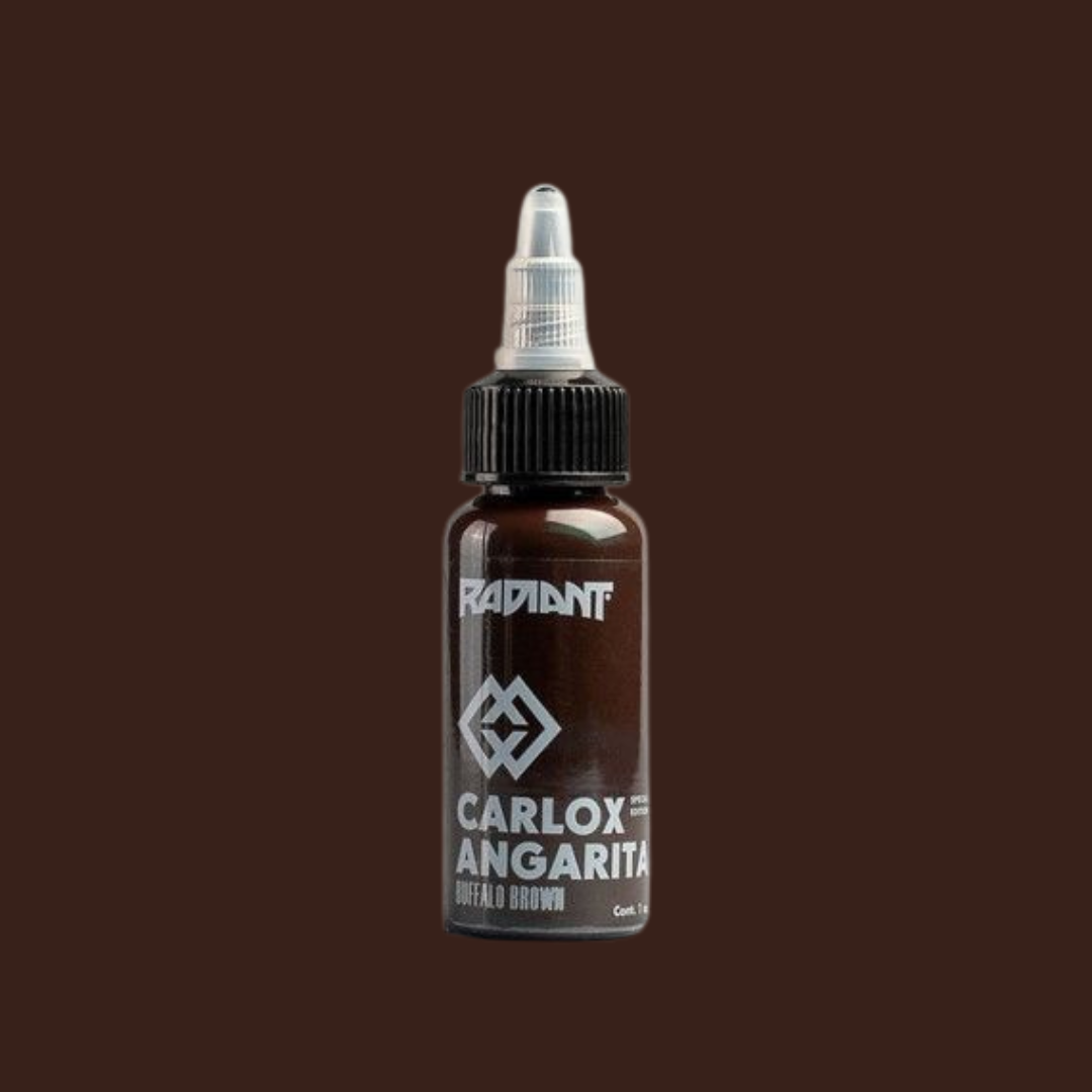 Buffalo Brown from the https://www.wholesalebodyjewellery.com/tattoo-supplies/product/tattoo-inks/radiant/carlox.html Carlox Angarita Set . Single bottle of https://www.wholesalebodyjewellery.com/tattoo-supplies/product/tattoo-inks/radiant.html Radiant Ink . Available in 1oz. Sterilised, easy to apply, pure, uncut homogenised pigment.