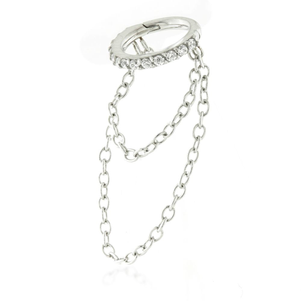 Steel Pave Gem Hinged Ring with Double Chain Gauge: 1.2mm Sizes: 6/7/8mm Gem Colour: CR CZ Gem Stones Chain Hangs Down Ear Cartilage 316L Surgical Steel