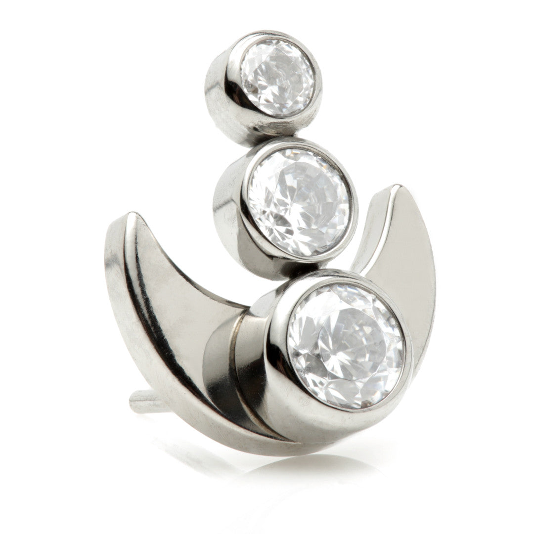 Titanium Threadless Moon Crescent with Triple Bezel Disk Attachment Gauge: 1.0/1.2/1.6mm (0.5mm threadless) Attachment Size: 6mm x 7mm Gem Size: 3*2.5*2mm Gem Colour: CR CZ Gem Stones Medical Grade Titanium 6Al-4VEli ASTM:F-136