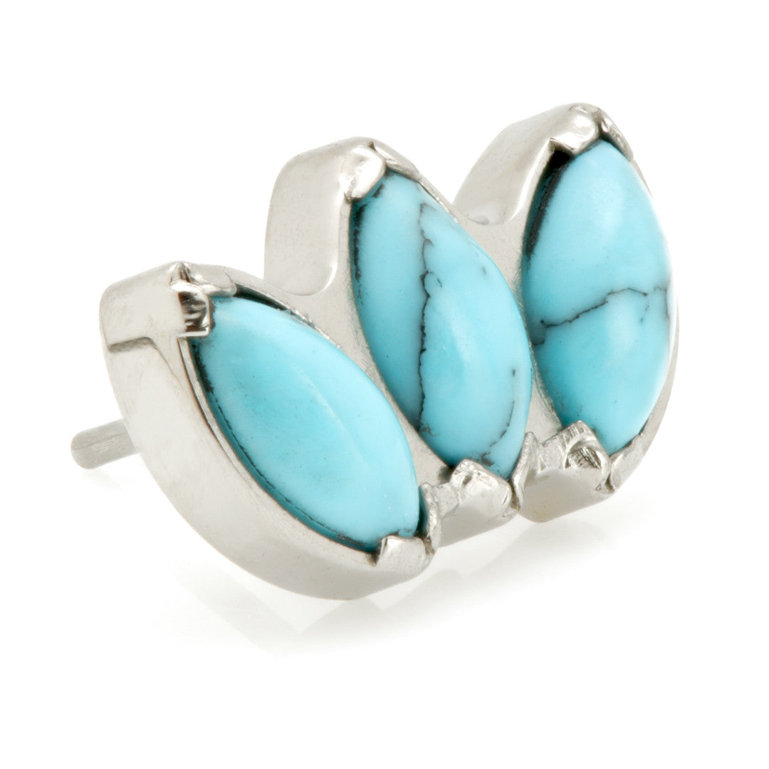 Ti Threadless Triple Marquise Attachment with Turquoise Stone Gauge: 1.0/1.2/1.6mm (0.5mm threadless) Size: 5mm x 8mm Stone Size: 1.5mm x 3mm Stone: Turquoise Medical Grade Titanium 6Al-4VEli ASTM:F-136