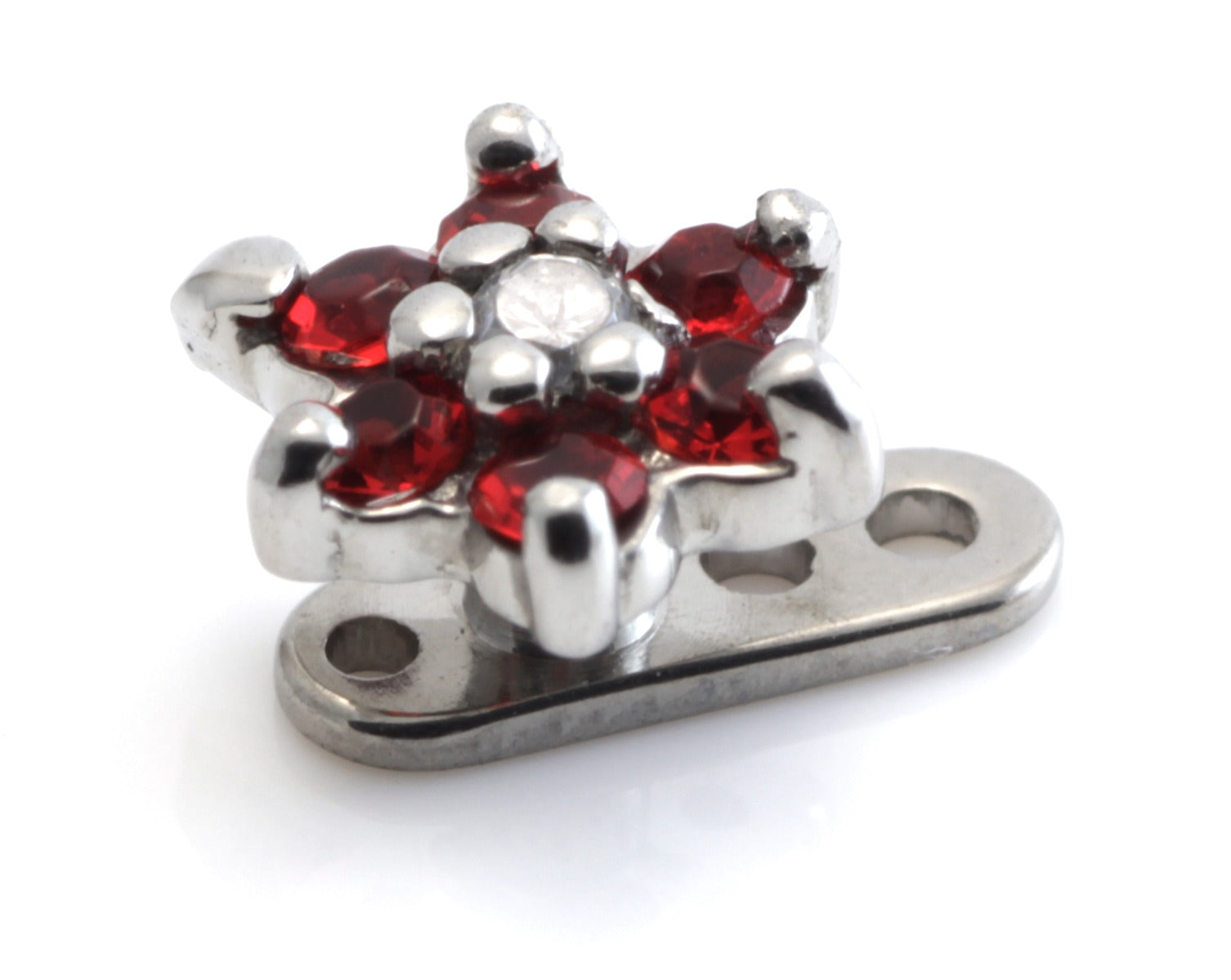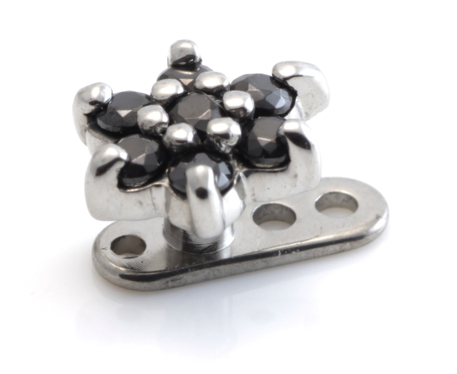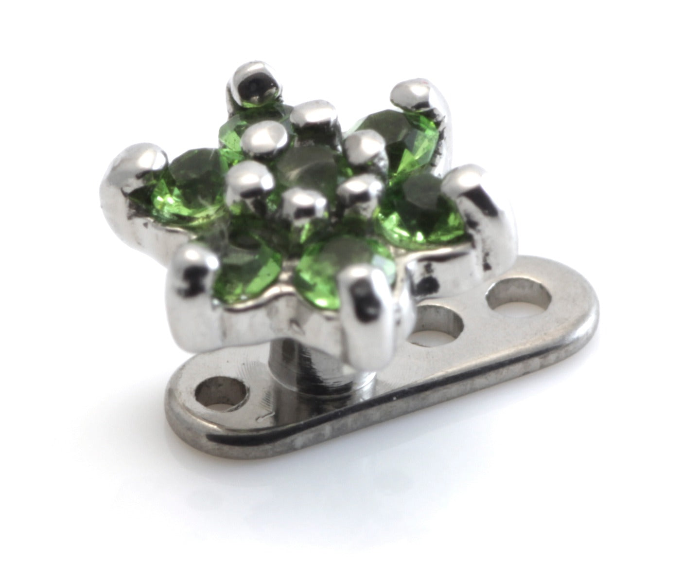 Titanium Implant Dermal Anchor (internal thread) with Multi Large Gem Steel Flower Dermal Anchor Height: 2mm or 2.5mm Gauge: 1.6mm Disk Size: 6mm or 10mm Gem Colour: Crystal, Aqua, AB, Rose, Jet, Peridot, Lt Siam