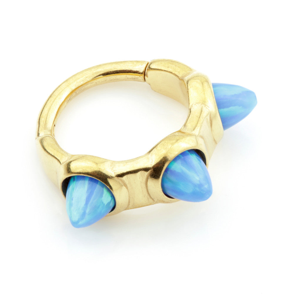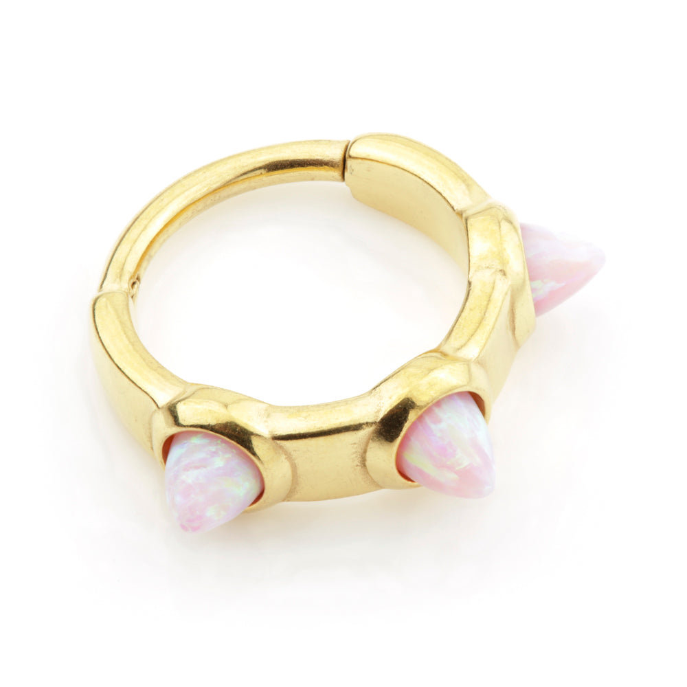 24K PVD on Steel Hinge Triple Cones Opal Hinge Segment Ring Size: 1.2mm x 8/10mm Opal Colours: White, Blue, Pink