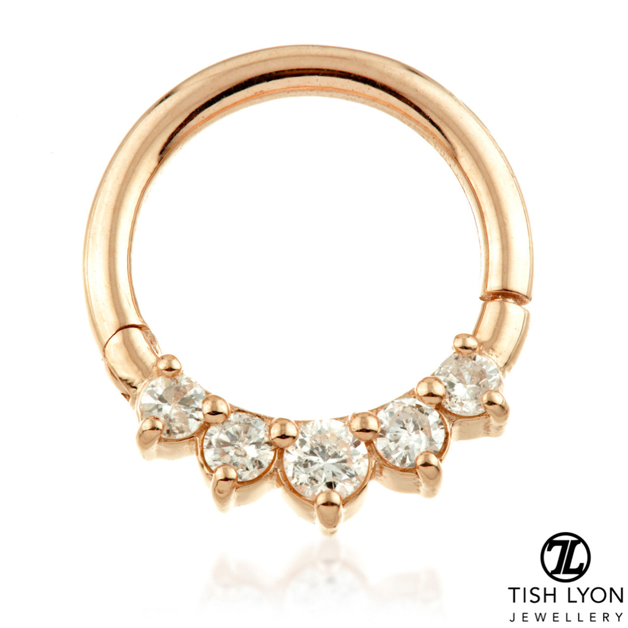 <p>TISH LYON® - Front Facing Gem Hinge Segment Ring</p> <p>14ct Yellow, White or Rose Gold<br> Diamonds (1.5*1.75*2*1.75*1.5mm) / Classification: VS2 G<br> Size: 1.2mm x 8mm<br> For Septum, Cartilage, Tragus, etc</p> <p>Packaged in small grey presentation box<br> Suitable for initial piercing<br> Laser Mark - 14K TL</p>