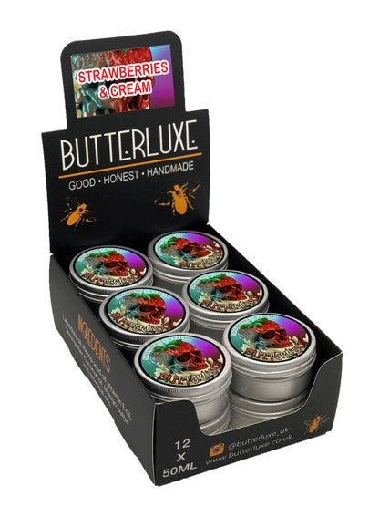 100% NATURAL 100% VEGAN Strawberries & Cream Butterluxe Balm is a Special Edition product. Artwork design and flavour choice by our very own Sponsored Artist Benj Ashmead of True Colours. With all the greatness of our original butters. Butterluxe Balm is a new, thicker consistency, with added flavours for you to try. Designed to be used during the tattoo process and for all your aftercare needs! Can be used as an all round moisturiser, to keep skin nourished and tattoo vibrancy. Luxury butter packed with anti-inflammatory and anti-bacterial properties, perfect for the healing process. For use during and after the tattoo process. Also beneficial for healed tattoos, keeping your skin nourished and preserving tattoo vibrancy. Store in a cool dry place, keep tin out of direct sunlight. INGREDIENTS: Calendula Oil, Hemp Seed Oil, Vitamin E Oil, Shea Butter, Coconut Oil, Mango Butter and Essential Oils.
