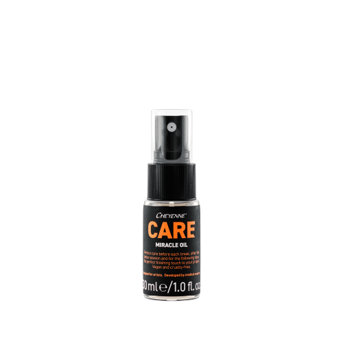 Tattoo oil for aftercare After tattooing comes skin care! And we have a completely new candidate for this: Miracle Oil does justice to its name it works miracles directly after the tattoo has been completed. The ingredients in the tattoo oil immediately soothe the skin and cover it with a nourishing film that prevents irritation. The oil can naturally be used during tattoo breaks or between several sessions, also by the customer at home. You'll never want to be without it! Advantages at a glance Best skincare product directly after tattooing Reduces itching and promotes healing Antibacterial and anti-inflammatory 30ml pump dispenser INGREDIENTS: PRUNUS AMYGDALUS DULCIS (SWEET ALMOND) OIL, OLEA EUROPAEA (OLIVE) FRUIT OIL, PRUNUS ARMENIACA (APRICOT) KERNEL OIL, BISABOLOL, TOCOPHERYL ACETATE, PENTAMETHYLCYCLOPENT-3-ENE-BUTANOL