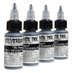 Includes 4x 1oz bottles of XXX Grey Wash inks by Silverback InkˆšÃ‡¬Ã† Precisely blended using Silverback InkˆšÃ‡¬Ã† XXX Black. Four distinct shades included, ranging from XXX1 as the lightest to XXX4 as the darkest of this series. XXX1 is perfect for those subtle tones. XXX2 is slightly darker, and ideal for grey lining a multiple-sitting piece. XXX3 is the perfect midtone. XXX4 is the darkest shade of this series. Goes into the skin as easily as it wipes off. Processed in a sterile facility. Packaged with a 100% tamper evident seal in the EU. Made in USA. By a tattooer for tattooers!