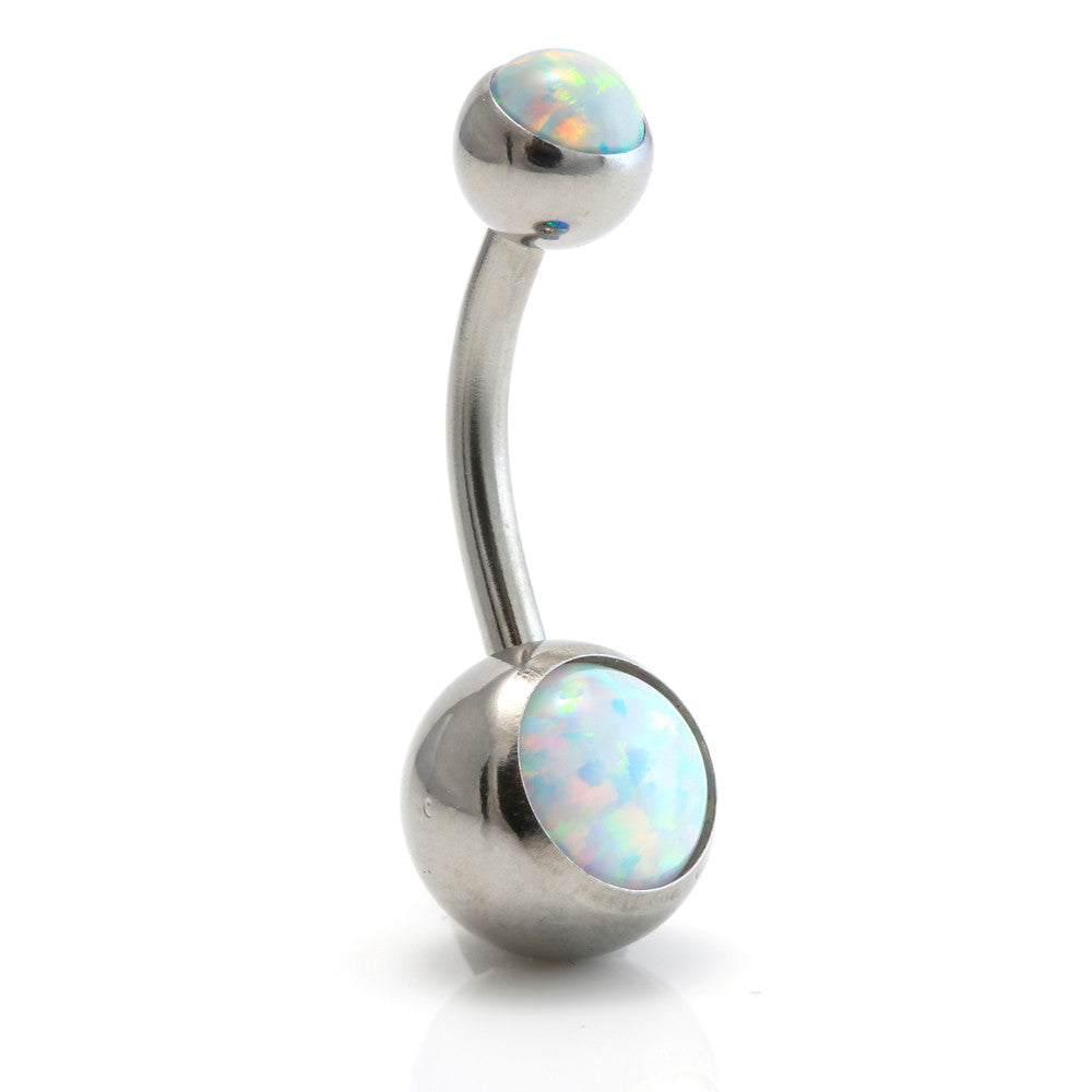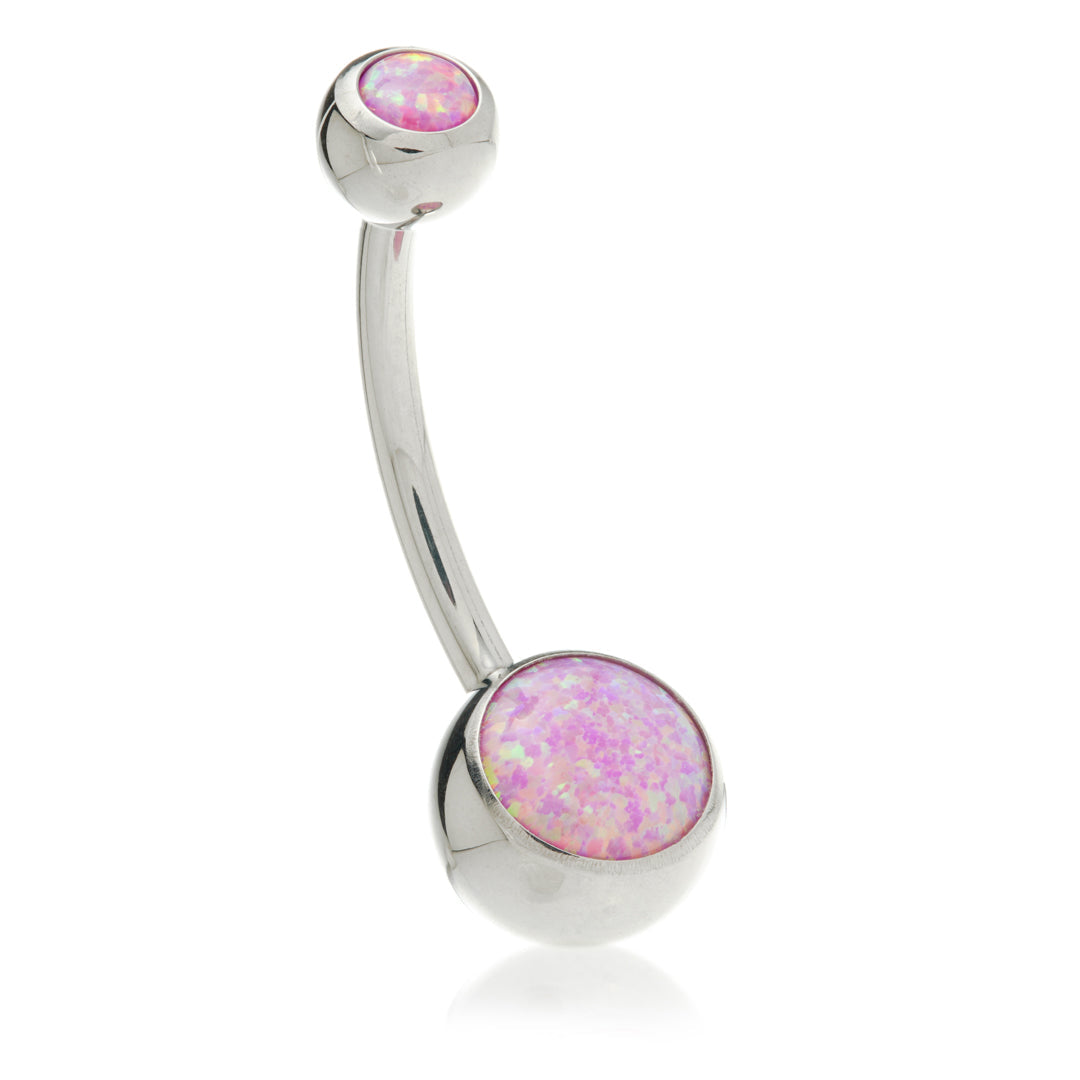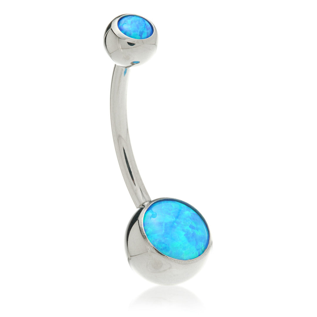 Internal Titanium Double Opal Navel Bar Gauge: 1.6mm (1.2mm internal thread) Size: 10mm Ball Sizes: 5mm + 8mm Opal Colours: Blue, Pink, White Fits QDD attachments Medical Grade Titanium 6Al-4VEli ASTM:F-136