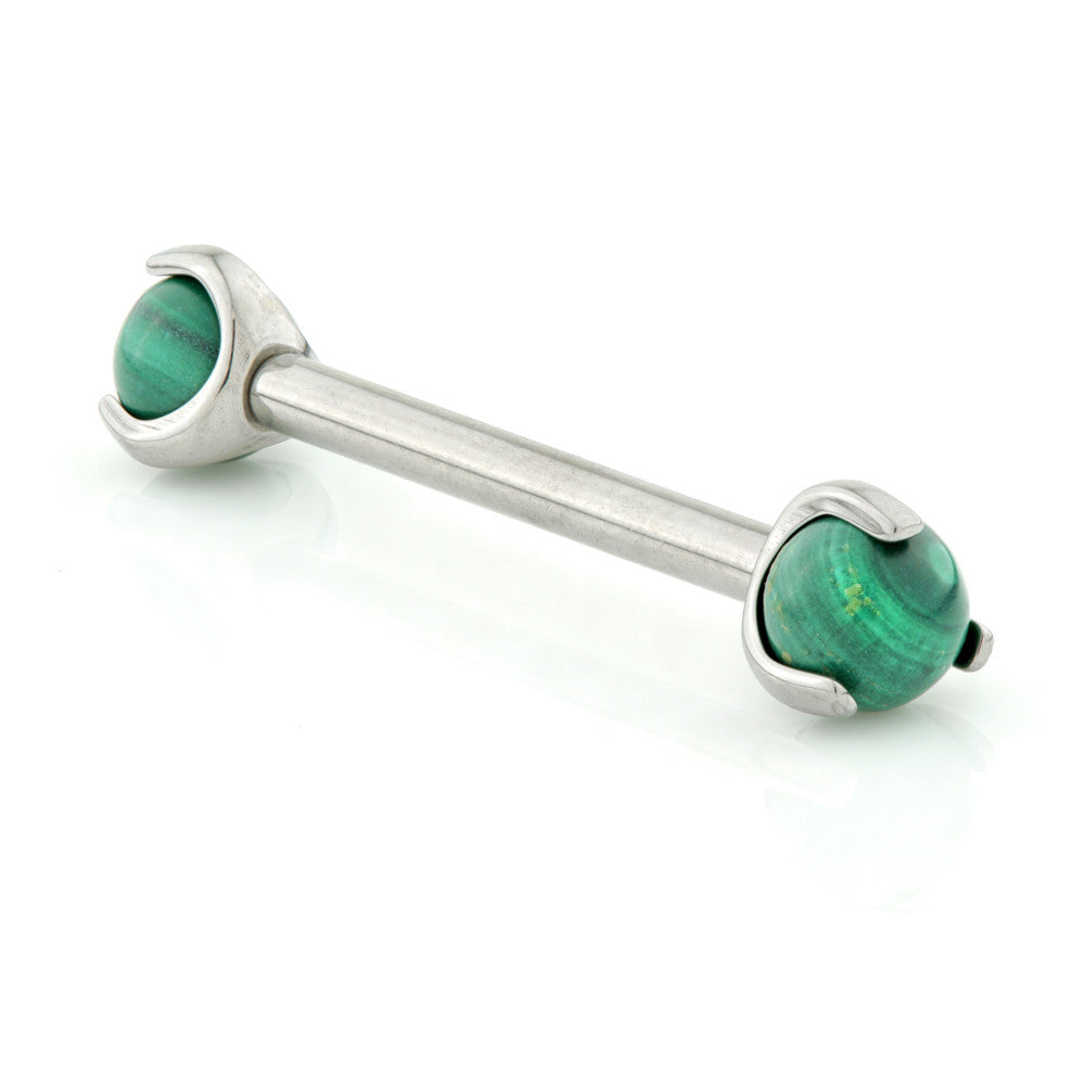 Internal Titanium Nipple Bar with Malachite Stone Please note, one end is fixed on to the bar and the other is removable. Gauge: 1.6mm Sizes: 12/14/16mm Medical Grade Titanium 6Al-4VEli ASTM:F-136