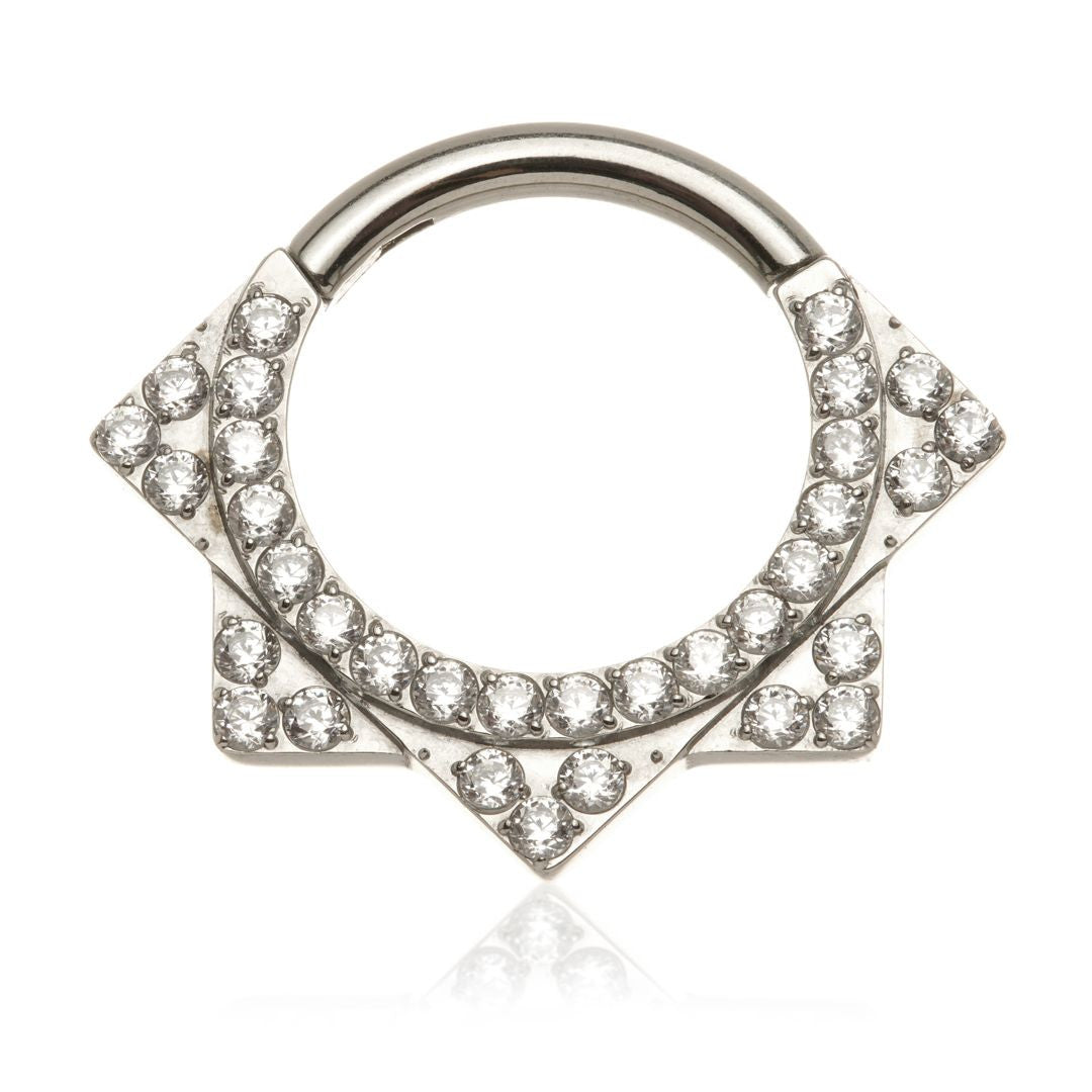Ti Couture Jewelled Star Hinged Ring </br> </p> Gauge: 1.2mm </br> Size: 8mm /10mm </br> CZ Gem Stones </br> </p> <p>Medical Grade Titanium 6Al-4VEli ASTM:F-136</p>