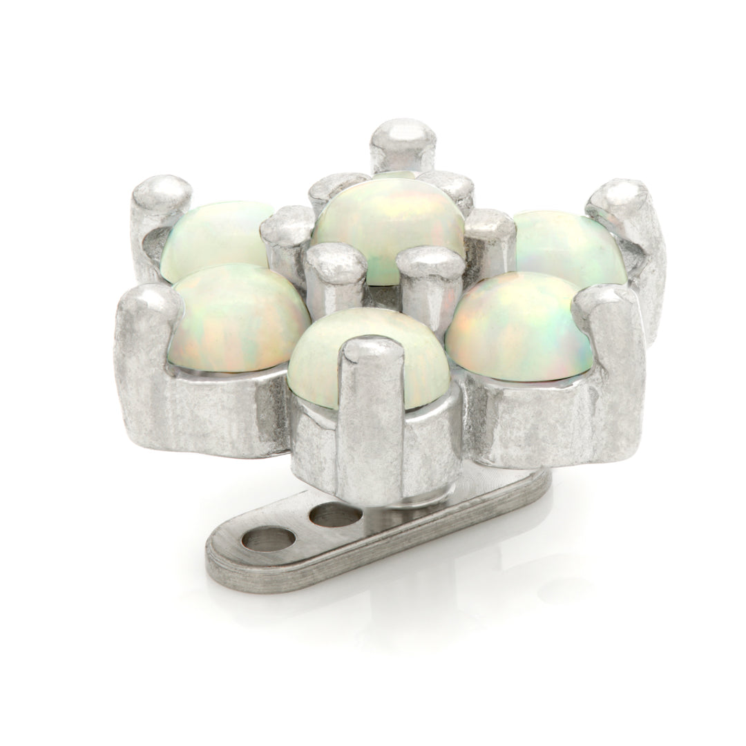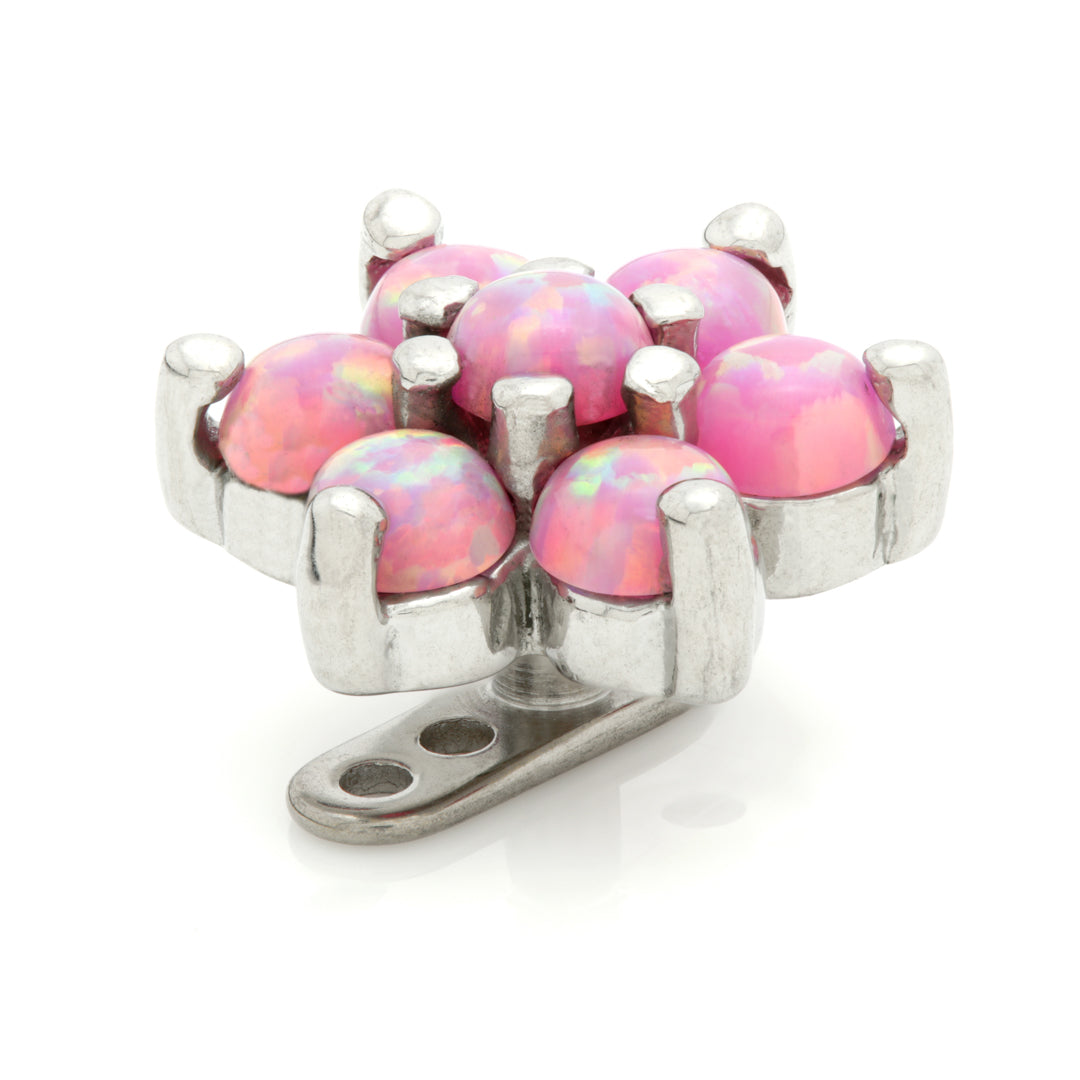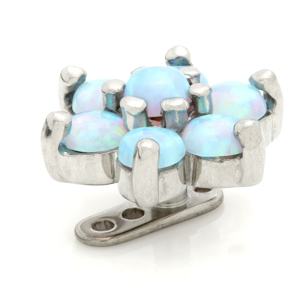 Titanium Implant Dermal Anchor (internal thread) with Multi Gem Steel Large Synthetic Opal Flower Gauge: 1.6mm Dermal Anchor Height: 2mm / 2.5mm Disk Size: 6mm / 10mm Opal Colour: WT, PK, BL