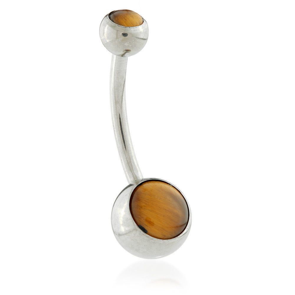 Ti Internal Navel Bar with Double Natural Tiger Eye Stone Gauge: 1.6mm Sizes: 10mm / 12mm Ball Sizes: 5mm + 8mm Gem Stone: Tiger Eye ASTMF F136