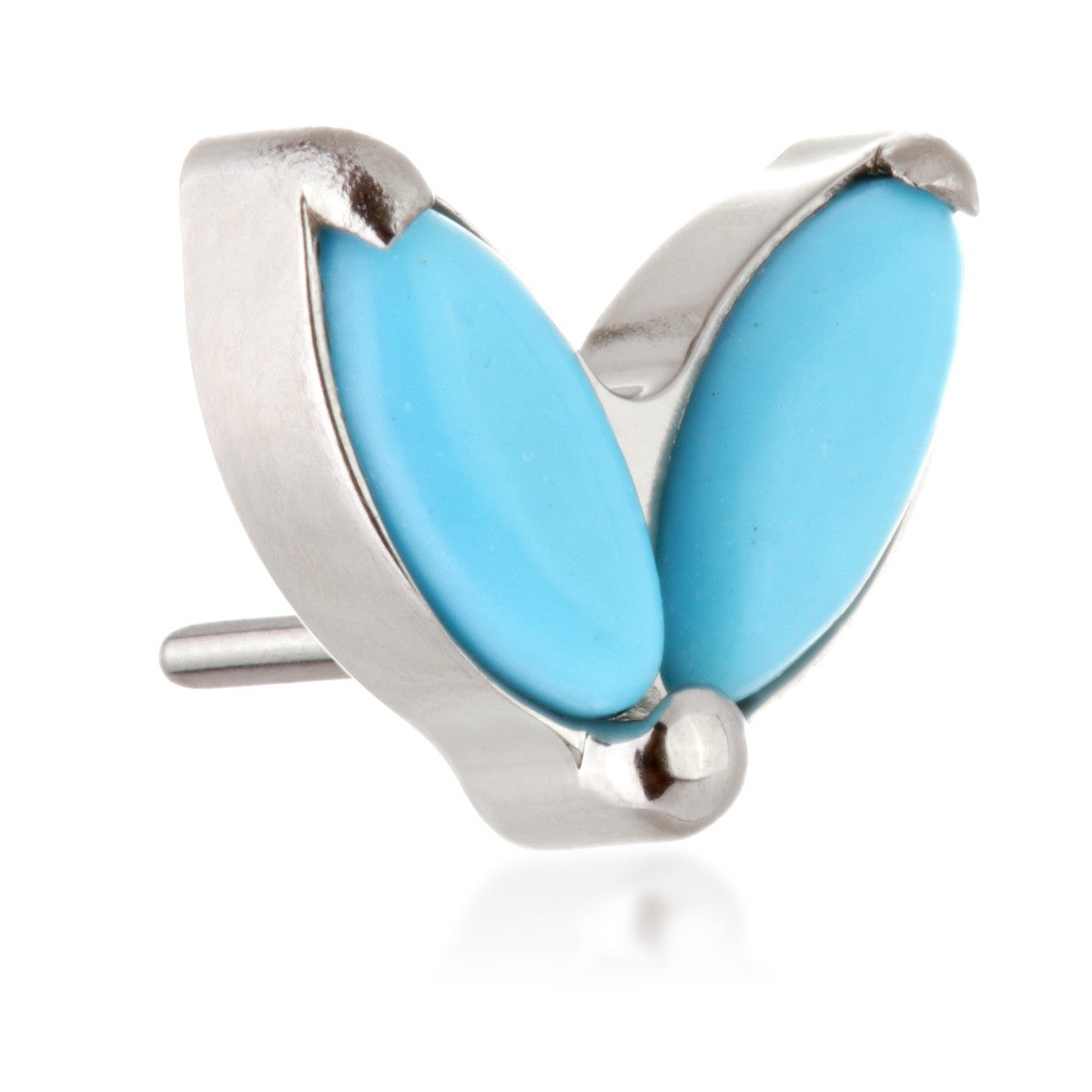 Titanium Threadless Double Marquise with Turquoise Stone Attachment Gauge: 1.0/1.2/1.6mm (0.5mm threadless) Attachment Size: 5.3mm x 5.6mm Stone: Turquoise Medical Grade Titanium 6Al-4VEli ASTM:F-136