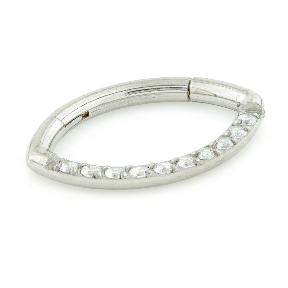 Titanium Marquise Hinged Gem Ring Gem Colour: Crystal Gauge: 1.2mm Sizes: 8mm and 10mm Medical Grade Titanium 6Al-4VEli ASTM:F-136