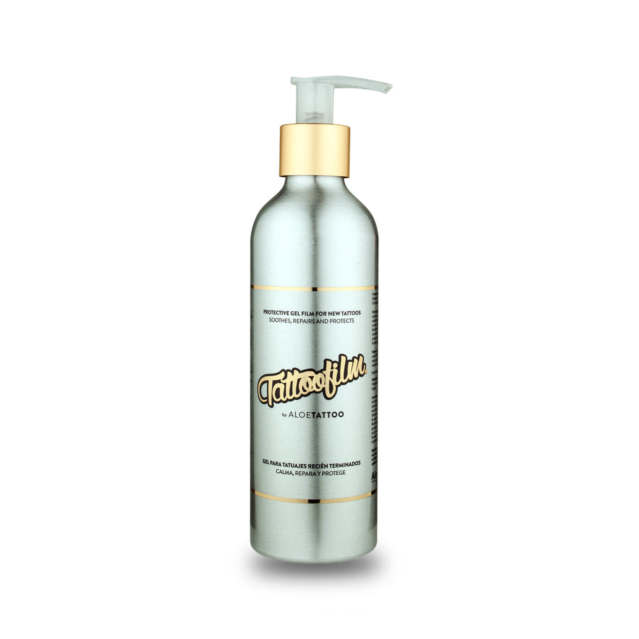 Aloe Tattoo has created the new Tattoofilm Gel, with completely natural ingredients, which provides your client with rapid relief, reduces inflammation, prevents bleeding and provides hour-long protection against clothing friction and environmental pollution. Instructions for use: Wash the recently finished tattoo with water and green soap. Dry with tissue paper towels without rubbing. Apply the Tattoofilm gel on the tattooed area and spread with a gentle massage until it is completely covered with a layer, the thickness of which will depend on the appearance of the skin of the new tattoo. Wait between 5 and 15 minutes for it to dry and for the film to form. Allow the product to act between 2 and 12 hours and start with daily care. The film is easily removed with soap and water. WARNING: Keep the product below 30ºC. Whenever the product is not being used, it is recommended to keep it in the refrigerator, to provide the natural active ingredients it contains with optimal storage conditions. Ingredients: Aloe Vera Chitosan Bisabolol Phragmites Communis Poria Cocos (Fu Ling fungus)