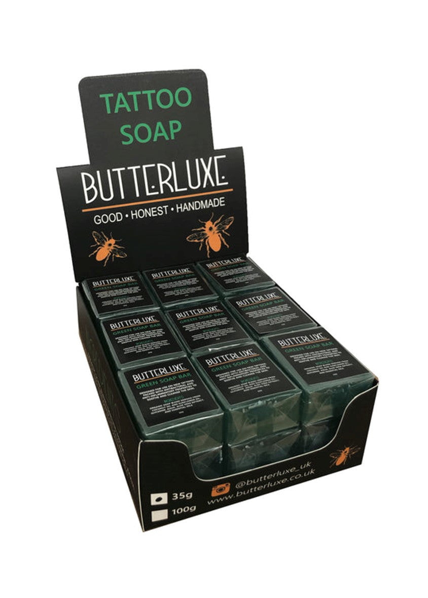 Butterluxe Green Soap Bar is designed for use on new tattoos. Packed with Antibacterial and Anti-inflammatory properties to soothe and cleanse the skin. All the goodness of our original green soap... in a solid bar! Perfect for customer aftercare. INGREDIENTS: Organic soap blend derived from coconut oil and sunflower oil. Glycerine, Aqua, Aloe Vera Extract and Essential Oils.